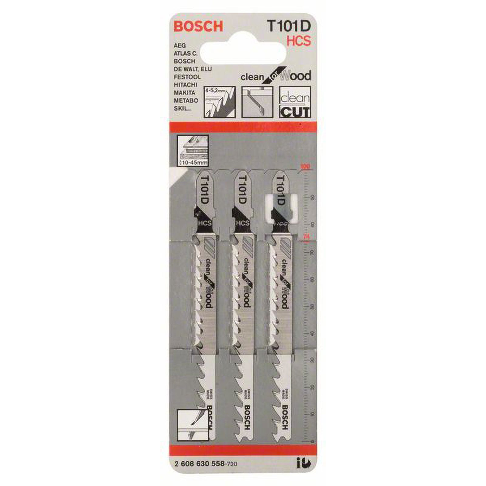 Das T 101 D Clean for Wood Stichsägeblatt macht saubere gerade Schnitte in Holz. Die präzisionsgeschliffenen Zähne mit Kegelschliffkörper bringen saubere Ergebnisse. Das Blatt aus Kohlenstoffstahl ist zum Schneiden von Weichholz und nicht-abrasiven Holzwerkstoffen geeignet. Es ist mit einer großen progressiven Zahnteilung (4-5,2 mm) ausgestattet, um Holzmaterialien mit einer Dicke von 10-45 mm zu schneiden.