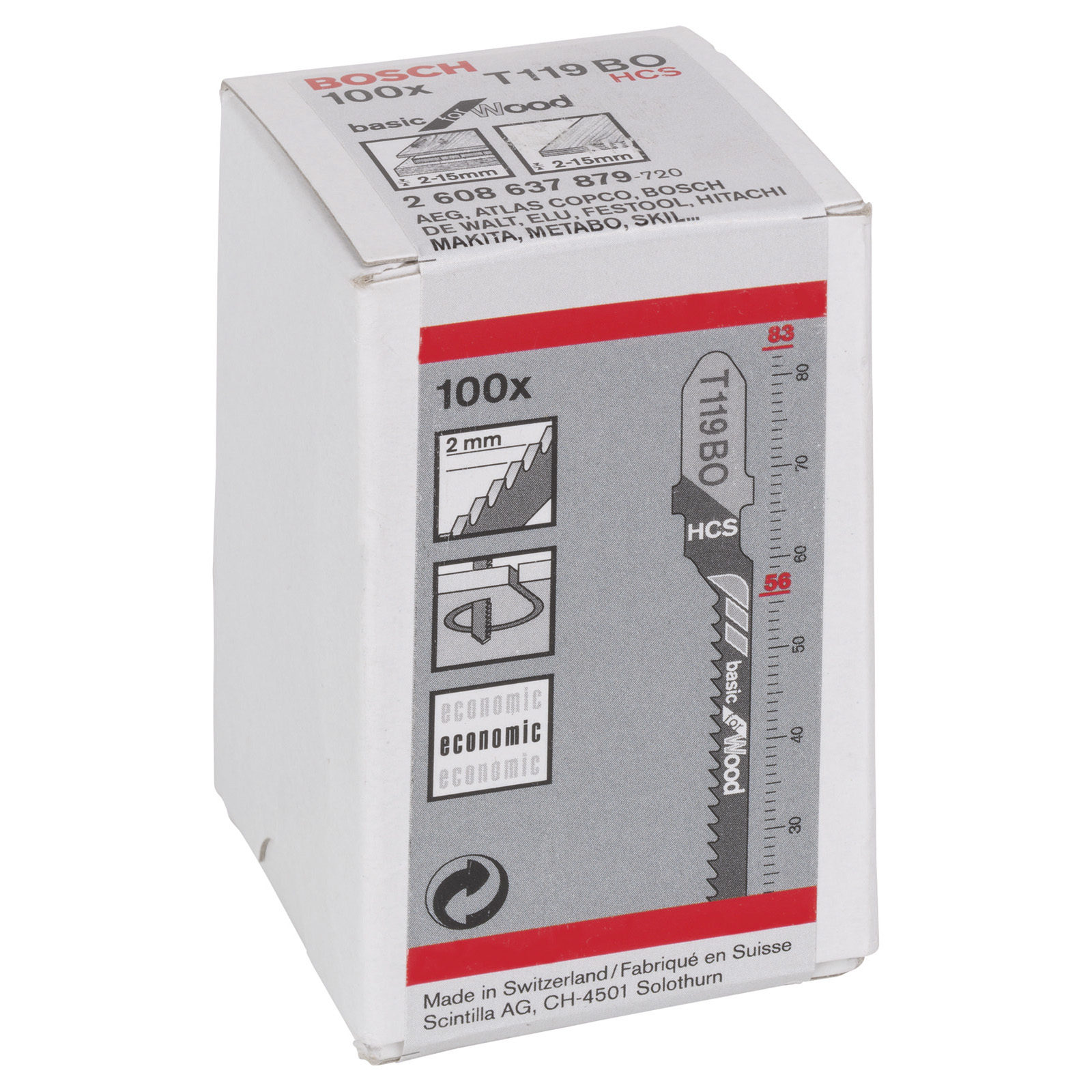 Für den Gebrauch mit Stichsägen mit T-Schaft-Aufnahme. Das T 119 BO Basic for Wood Stichsägeblatt macht Kurvenschnitte in Holz. Die gefrästen, gewellten Zähne sind ideal für Schnitte ohne besondere Anforderungen. Das schmale Blatt ist für Kurvenschnitte optimiert. Das Blatt aus Kohlenstoffstahl ist für Weichholz und nicht-abrasive Holzwerkstoffe geeignet. Die feine Zahnteilung (2 mm) ermöglicht das Schneiden dünner Holzmaterialien mit einer Dicke von 2-15 mm.