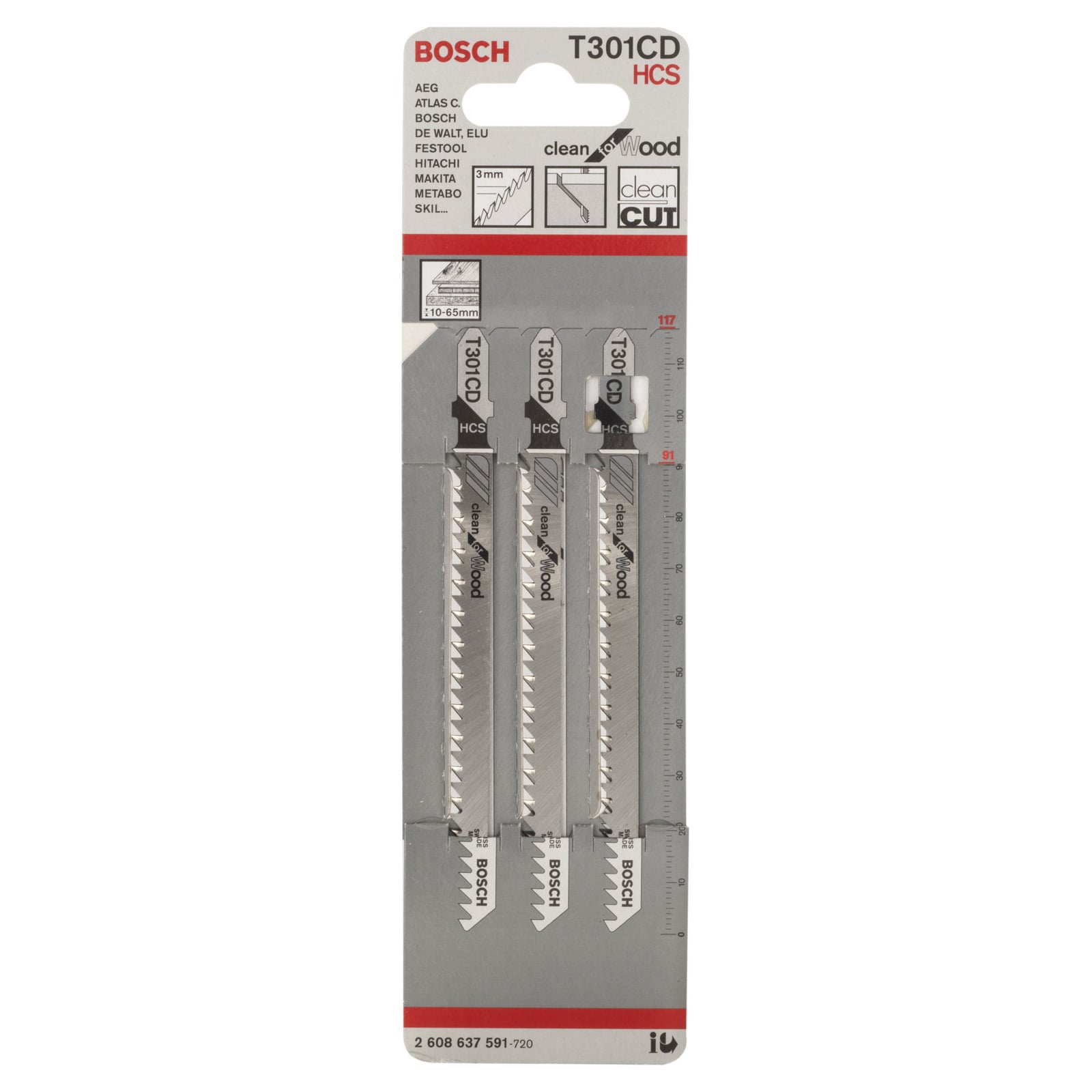 Für den Gebrauch mit Stichsägen mit T-Schaft-Aufnahme. Das T 301 CD Clean for Wood Stichsägeblatt macht saubere gerade Schnitte in Holz. Die präzisionsgeschliffenen Zähne mit Kegelschliffkörper bringen saubere Ergebnisse. Das Blatt aus Kohlenstoffstahl ist zum Schneiden von Weichholz und nicht-abrasiven Holzwerkstoffen geeignet. Es ist mit einer mittleren Zahnteilung (3 mm) und einer großen Länge (117 mm) ausgestattet, um Holzmaterialien mit einer Dicke von 10-65 mm zu schneiden.