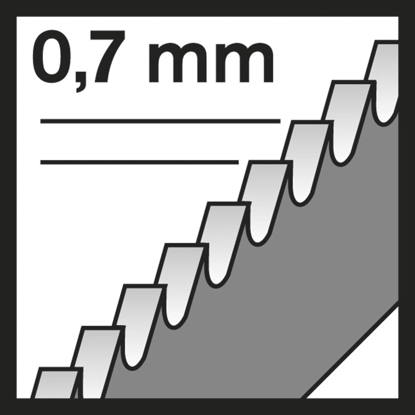- Sehr feine Zahnteilung (0,7 mm) schneidet sehr dünne massive Metallbleche mit einer Dicke von 0,5-1,5 mm