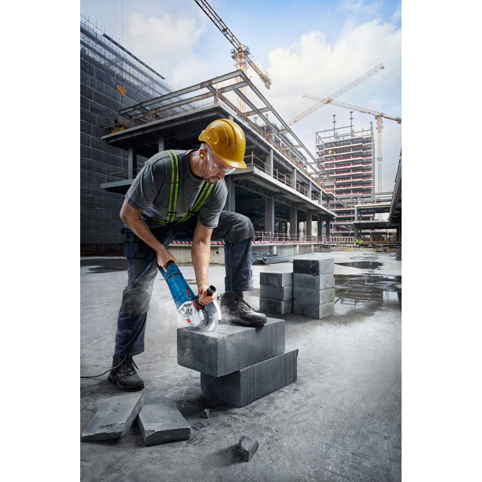 Winkelschleifer GWS 27-180 JR, Die Suche nach einem benutzerfreundlichen und komfortablen und gleichzeitig leistungsstarken Winkelschleifer kann eine Herausforderung sein. Der GWS 27-180 JR Professional erledigt dank seiner hohen Leistung schwierige Arbeiten schneller. Sein kraftvoller 2.700-W-Motor sorgt für mehr Effizienz, indem er mehr Material in kürzerer Zeit abträgt. Der Haupthandgriff sorgt für bequemes Handling und lässt sich auf Knopfdruck um 90° drehen. So hast du immer den perfekten Griff – ob fürs Schleifen oder Trennen. Die Sperrfunktion gewährleistet, dass das Werkzeug erst startet, wenn der Haupthandgriff vollständig um 90° gedreht und mit einem „Klick“ eingerastet ist. Darüber hinaus ist der GWS 27-180 JR Professional mit KickBack Control und Vibration Control ausgestattet. Der GWS 27-180 JR Professional ist das Werkzeug der Wahl zum Schleifen und Trennen von Metall, Stein und Fliesen. Er bietet Wiederanlaufschutz, Sanftanlauf und eine praktische, schlüssellose Haube für Schleifanwendungen. Karton. Zusatzhandgriff Vibration Control (2 608 900 000). Schnellverstellbare Schutzhaube (2 605 510 280). Aufnahmeflansch (1 605 703 099). Spannmutter (1 603 340 040). Zweilochschlüssel (1 607 950 048)