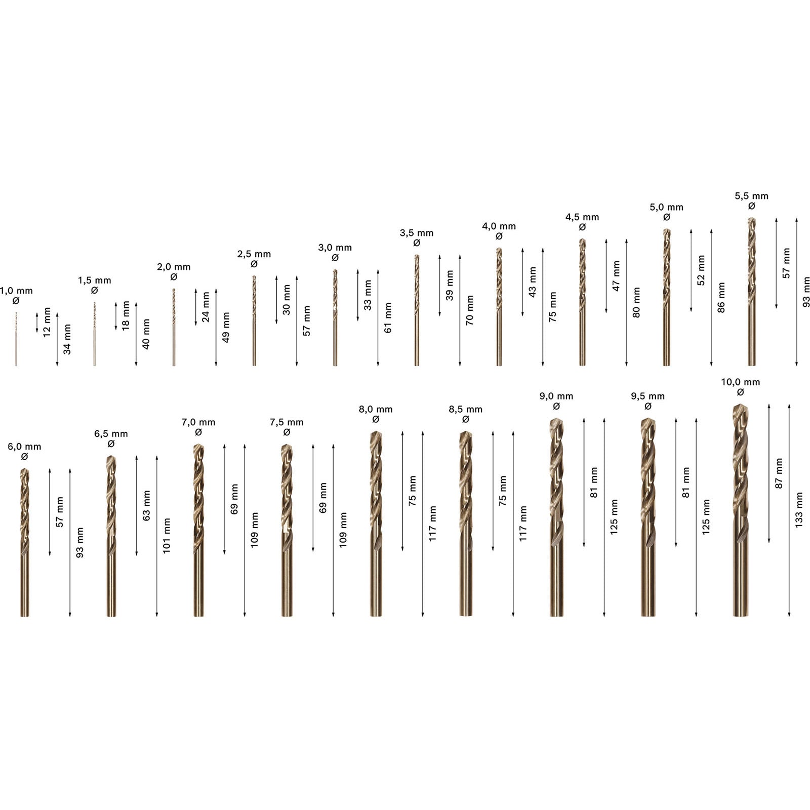 - Nach DIN 338 gefertigt, Bohrertyp N (kleiner Seitenspanwinkel) mit Spitzenwinkel 135 Grad und Durchmessertoleranz h8