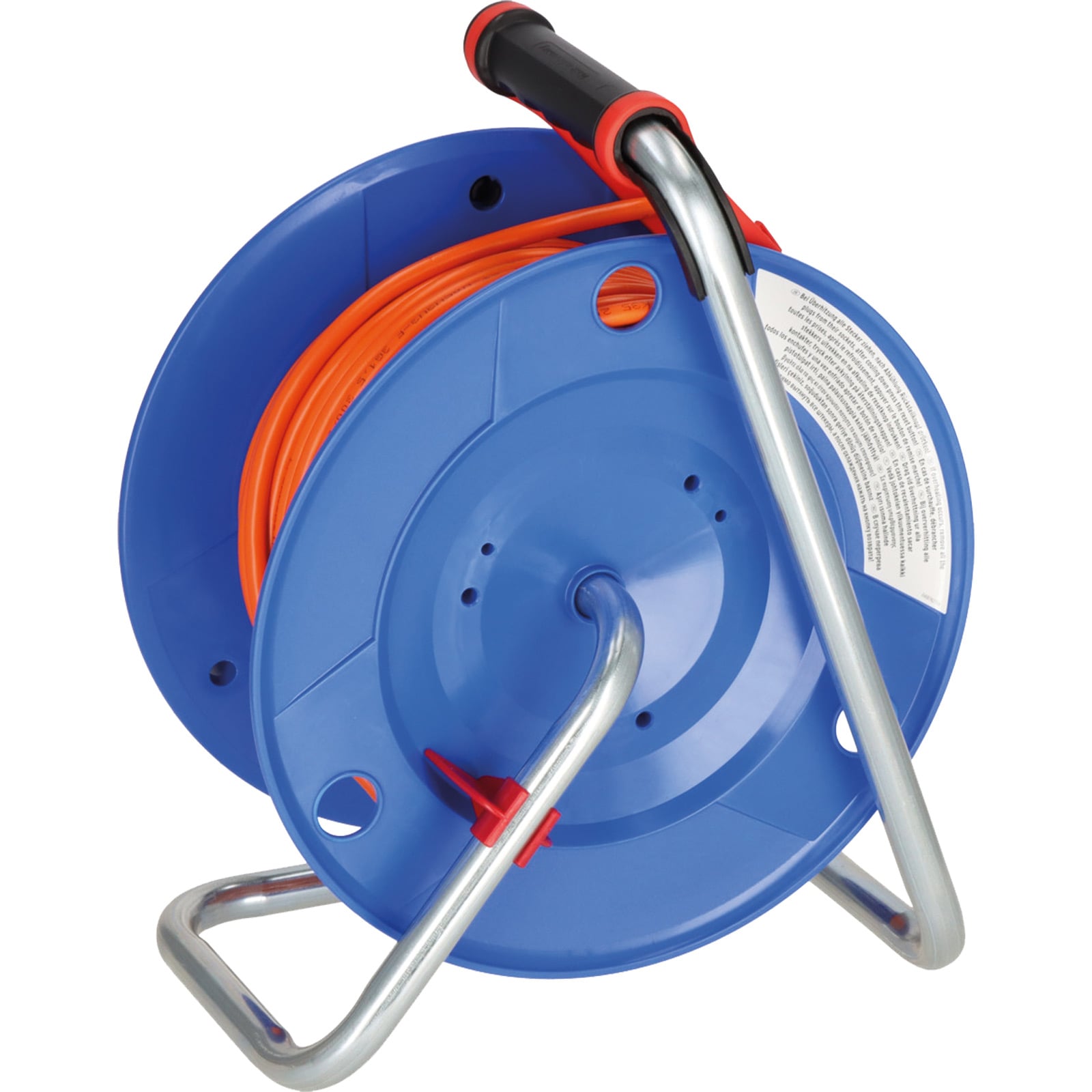 - Kabeltrommel mit blauem Trommelkörper aus Spezialkunststoff auf verzinktem Tragegestell