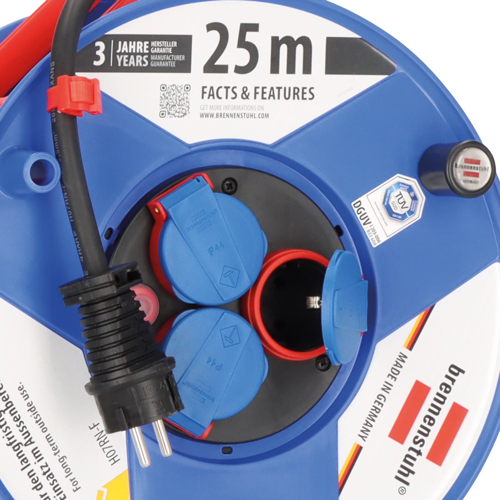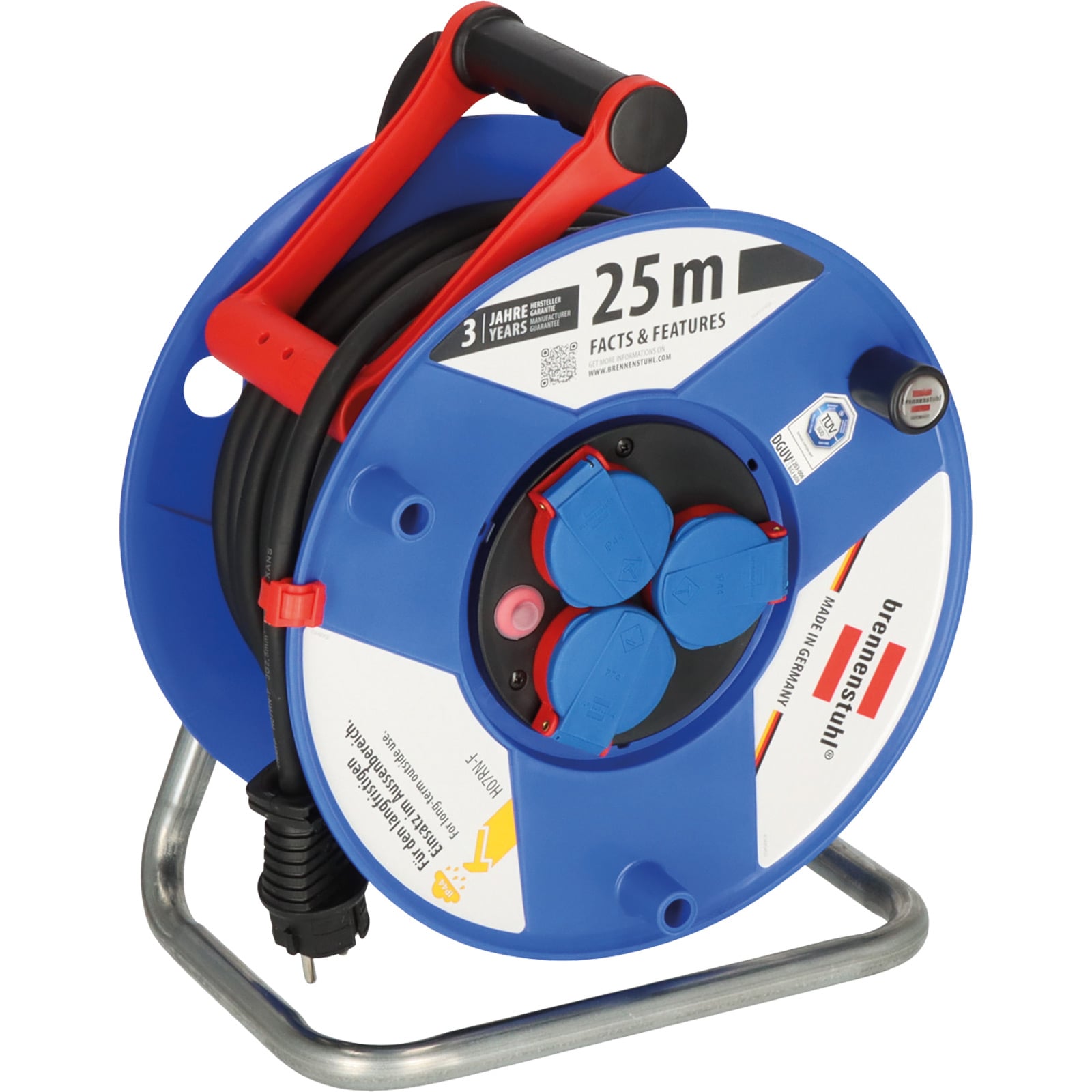 - Kabeltrommel 25m mit 3 Schutzkontakt-Steckdosen, spritzwassergeschützt, mit selbstschließenden Deckeln
