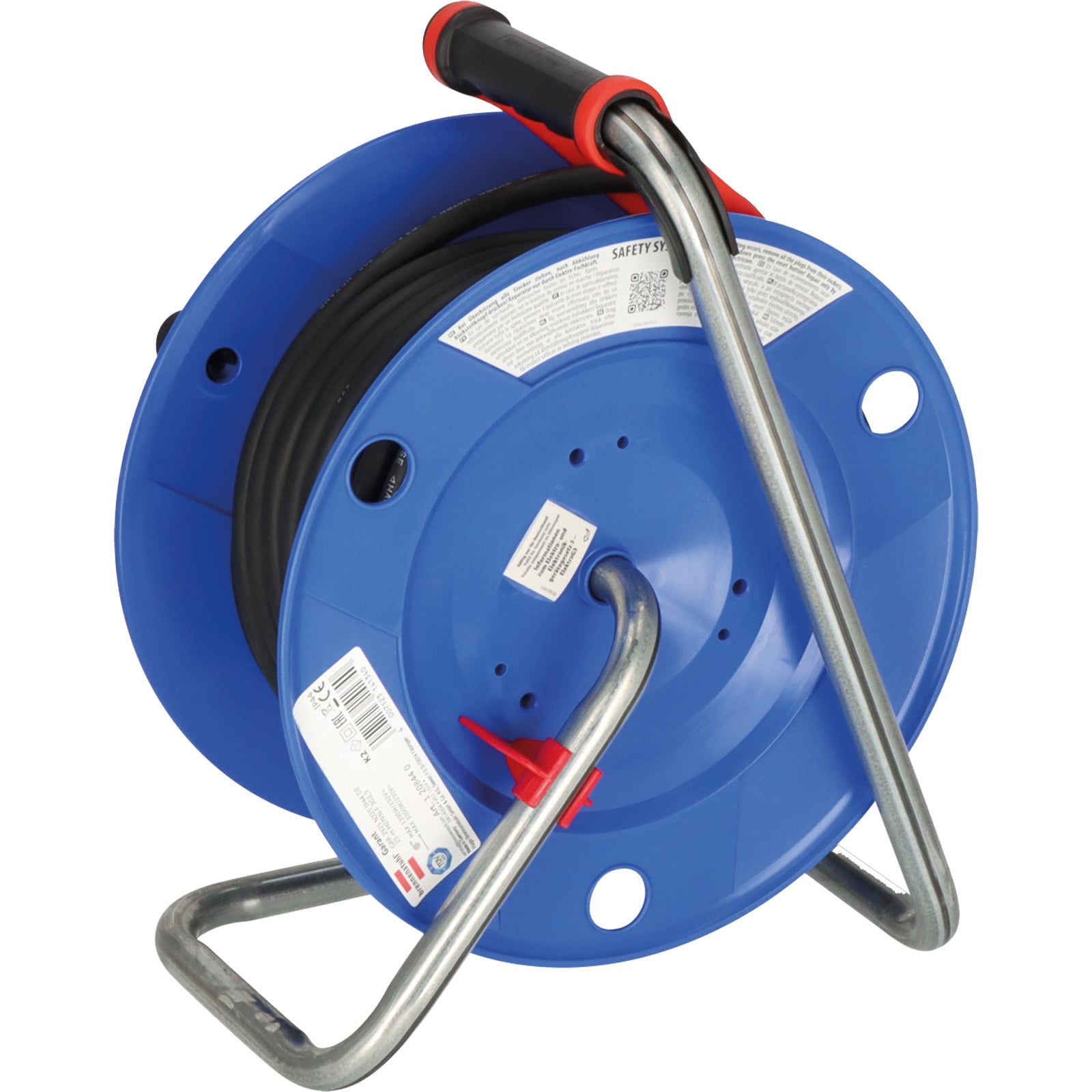 - Kabeltrommel mit einem Trommelkörper aus Spezialkunststoff auf verzinktem Tragegestell