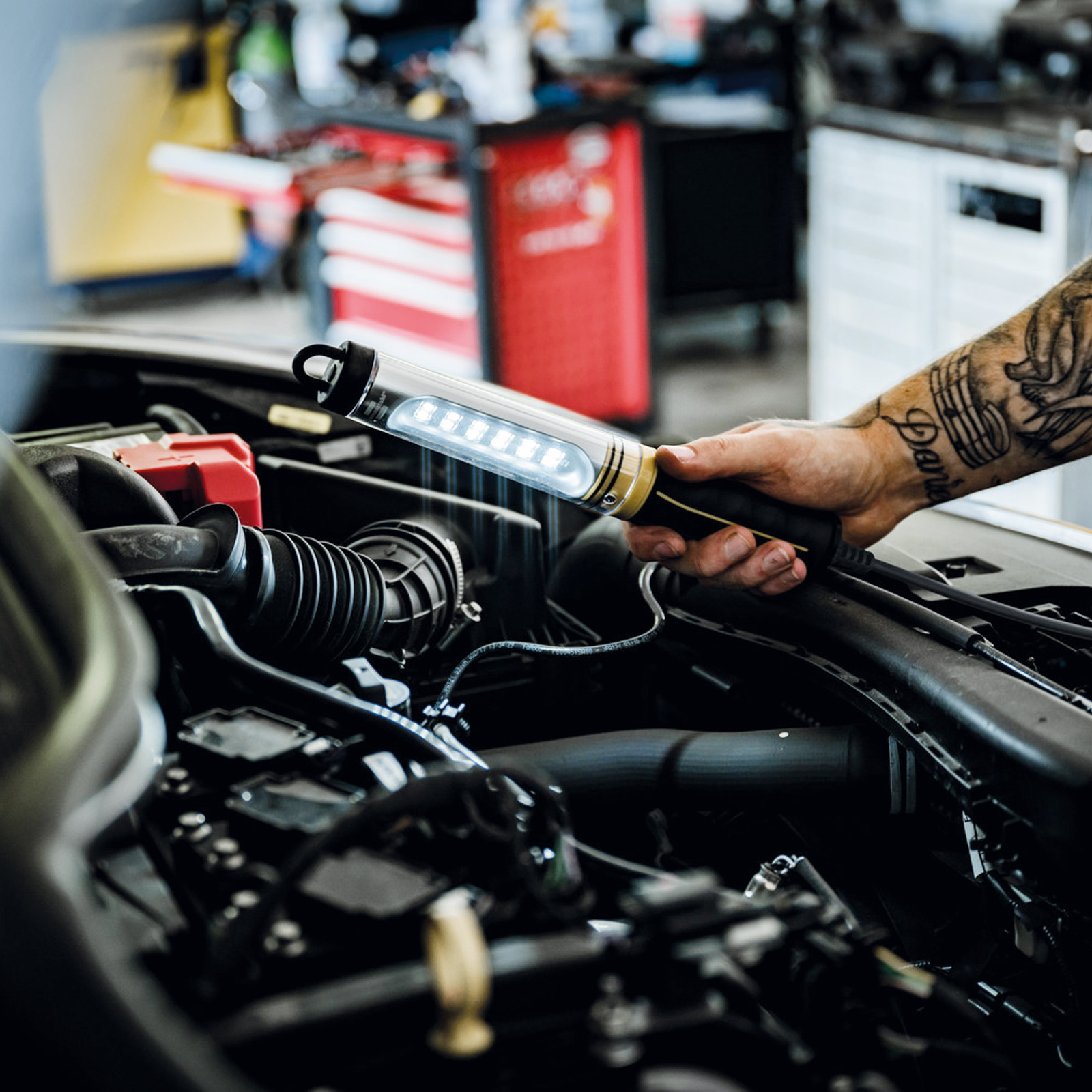 - Werkstattleuchte mit gummiertem Griff verfügt über ein 5 m langes Kabel, welches Arbeiten in einem großen Radius ermöglicht