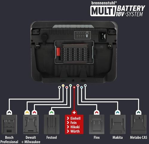 - Kompatibel mit verschiedenen 18V Akkus (verschiedene Ah Klassen) der Powertool-Hersteller Bosch Professional, Dewalt, Einhell, Fein, Festool, Flex, Hikoki, Makita, Metabo CAS, Milwaukee und Würth