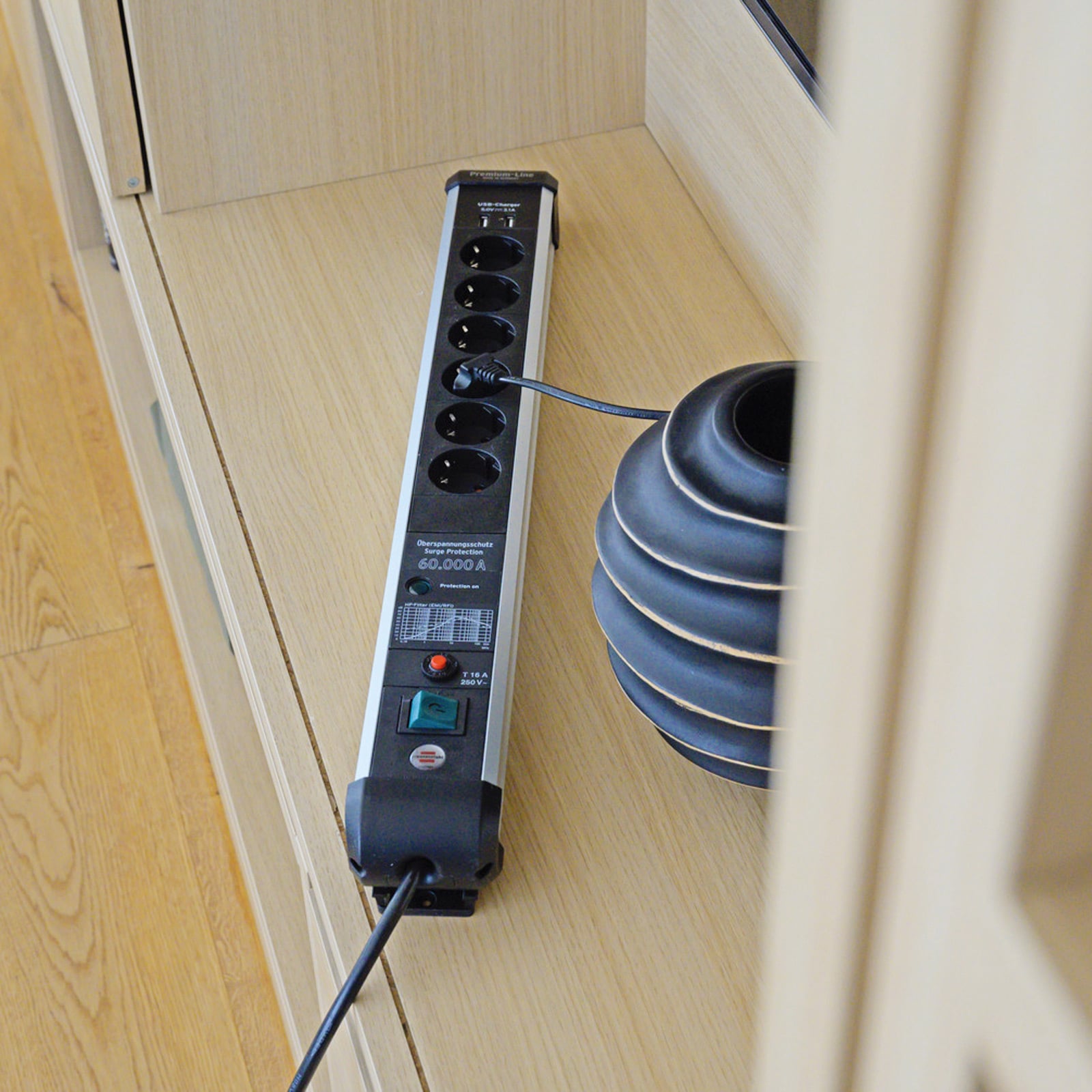 - Mehrfachsteckdosenleiste mit Überspannungsschutz können Spannungsspitzen reduzieren, sodass die angeschlossenen Geräte nicht beschädigt werden