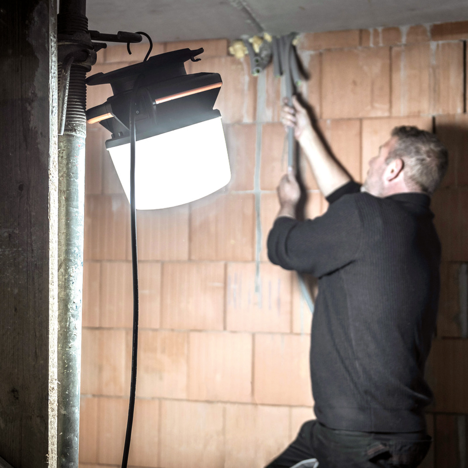 - LED Arbeitsleuchte 360° eignet sich dank Schutzart IP54 (staub- und spritzwassergeschützt) und dem ölbeständigen RN-Kabel perfekt für den ständigen Einsatz im Außenbereich und ist zudem industrietauglich