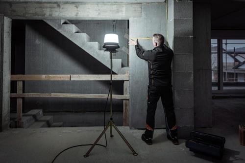 - Mobiler LED Strahler für die Baustelle 47 W zur Raumausleuchtung aus robustem, bruch- und schlagfestem Kunststoffgehäuse mit spritzwassergeschützter Steckdose mit selbstschließendem Deckel