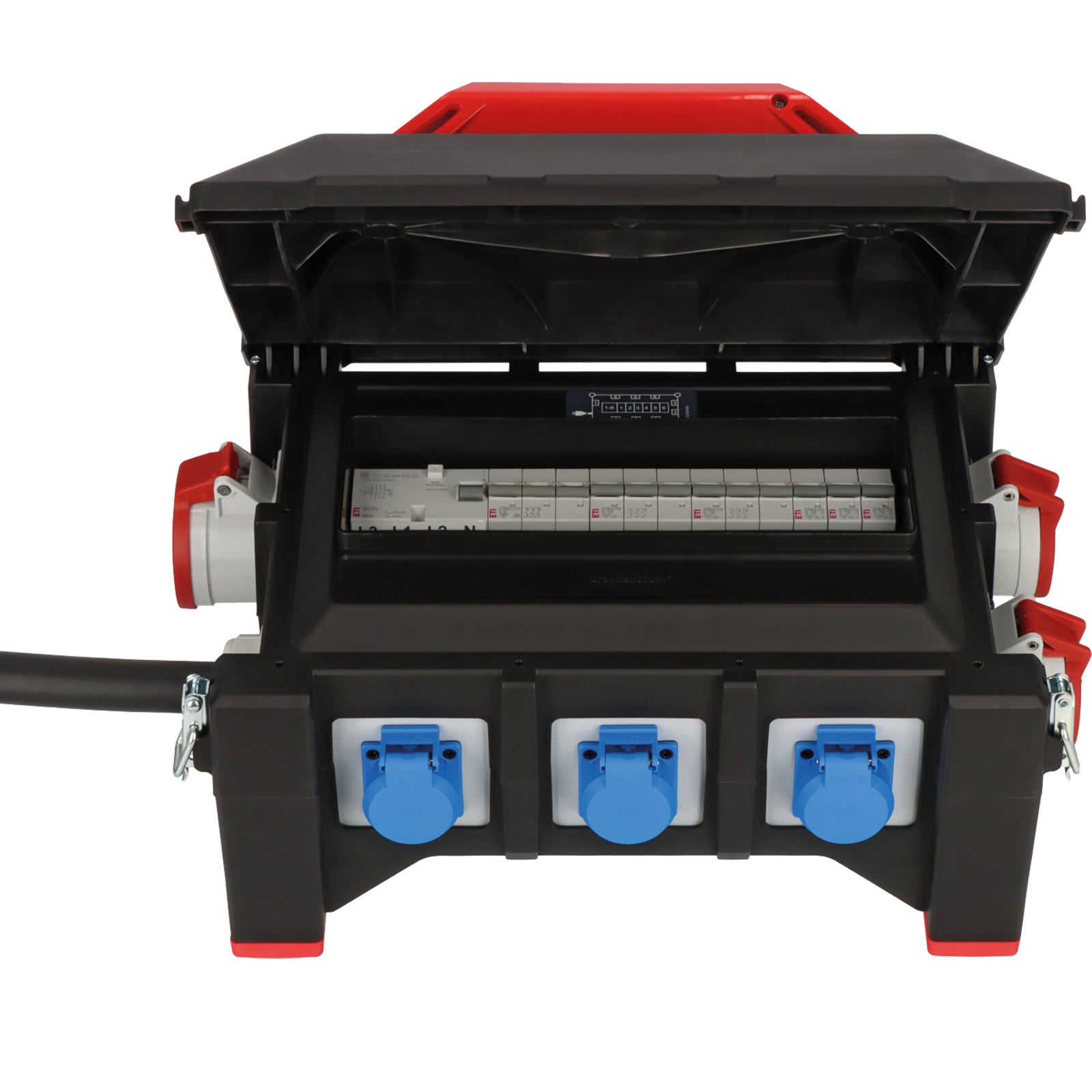 - Der Gummi-Baustromverteiler entspricht DIN VDE 0100-704 und ist mit einem FI-Schalter Typ B (Sicherungselemente FI-und LS-Schalter im Verteiler-Innenraum) und einem Gurt zur Fixierung des Kabels ausgestattet