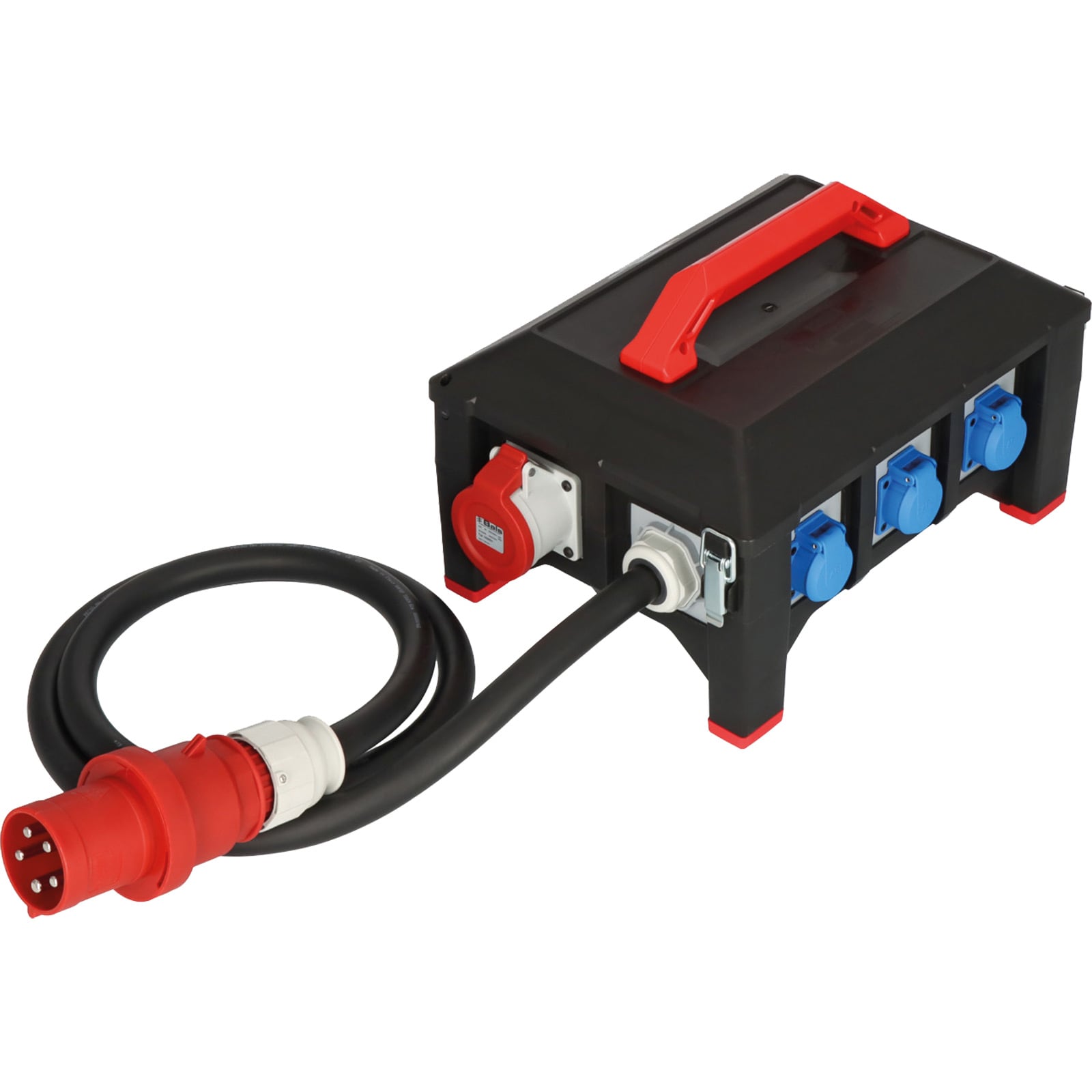 - Stromverteiler für den ständigen Einsatz im Freien mit 2m ölbeständigem Gummi-Kabel (H07RN-F 5G16,0) und einem spritzwassergeschütztem Gehäuse aus Spezial-Gummimischung (beständig von -30°C bis +80°C)
