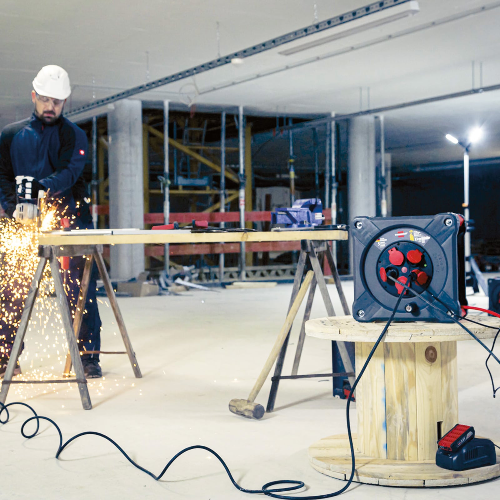 - Kabeltrommel mit 33m Kabellänge (H07BQ-F 3G2,5) und Rundum-Überrollschutz - für den Baustelleneinsatz nach DGUV 203-006 (ehem. BGI 608) und den ständigen Einsatz im Freien