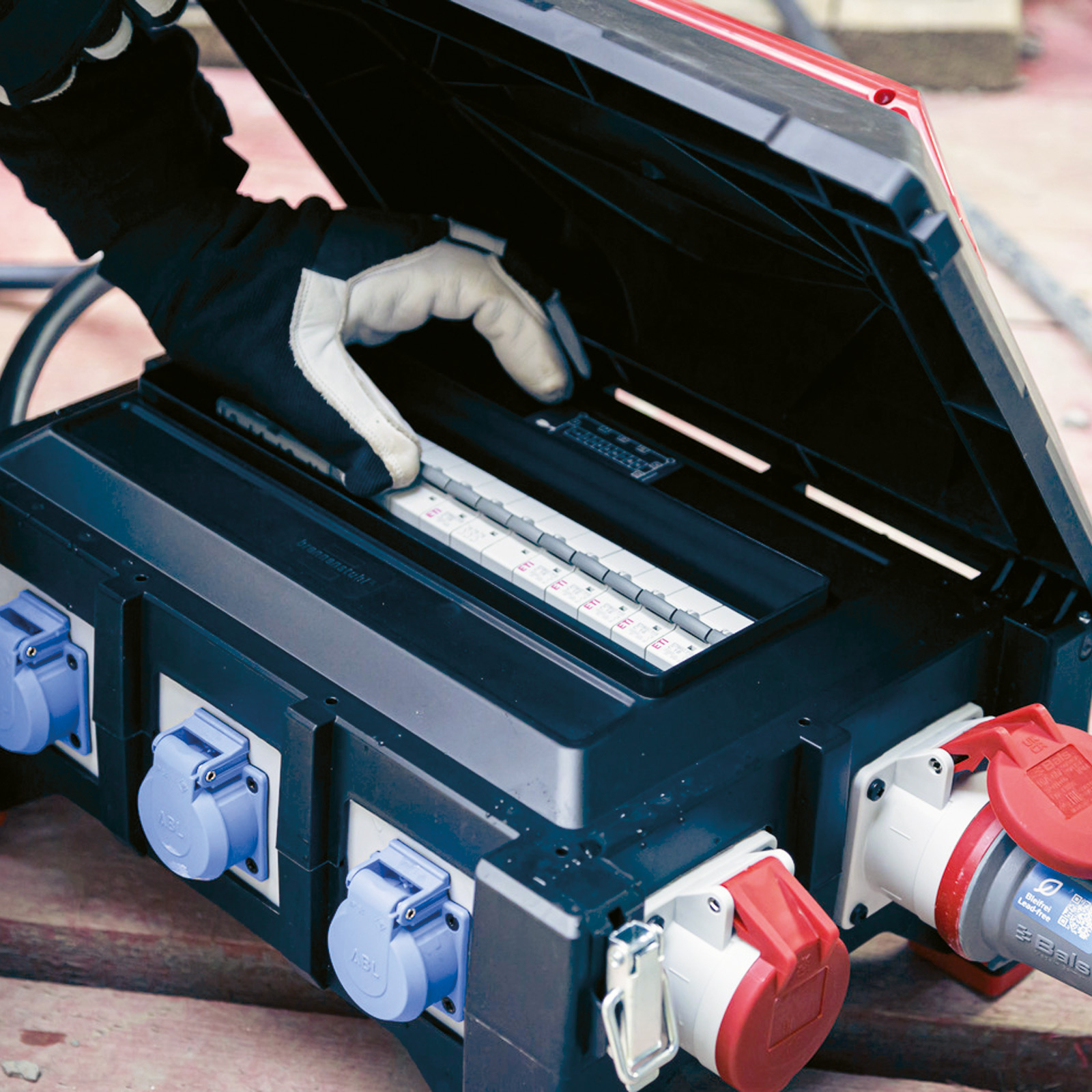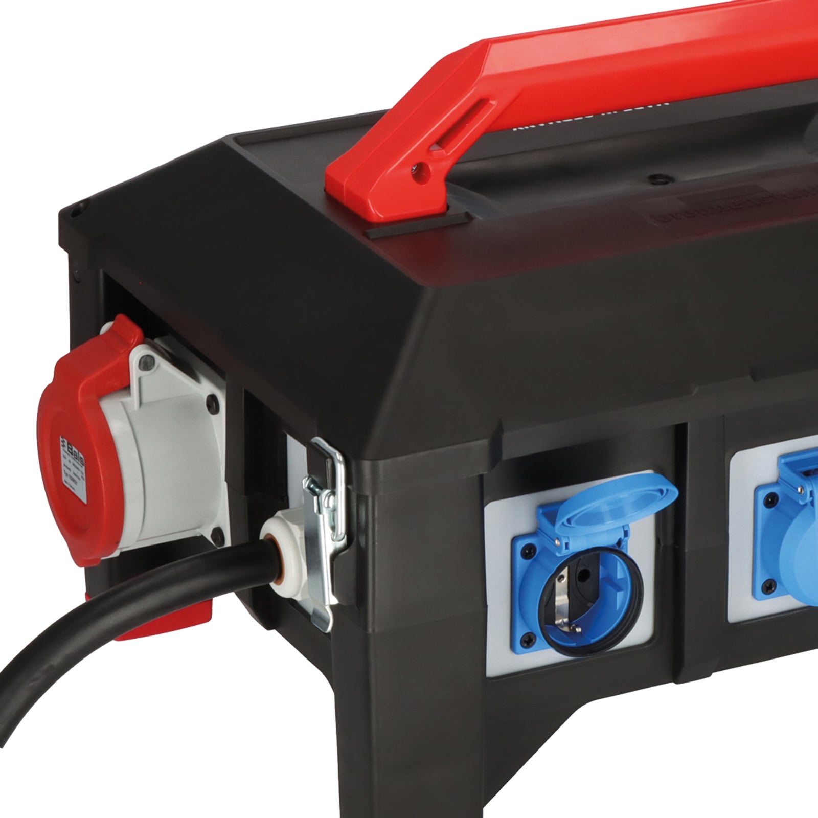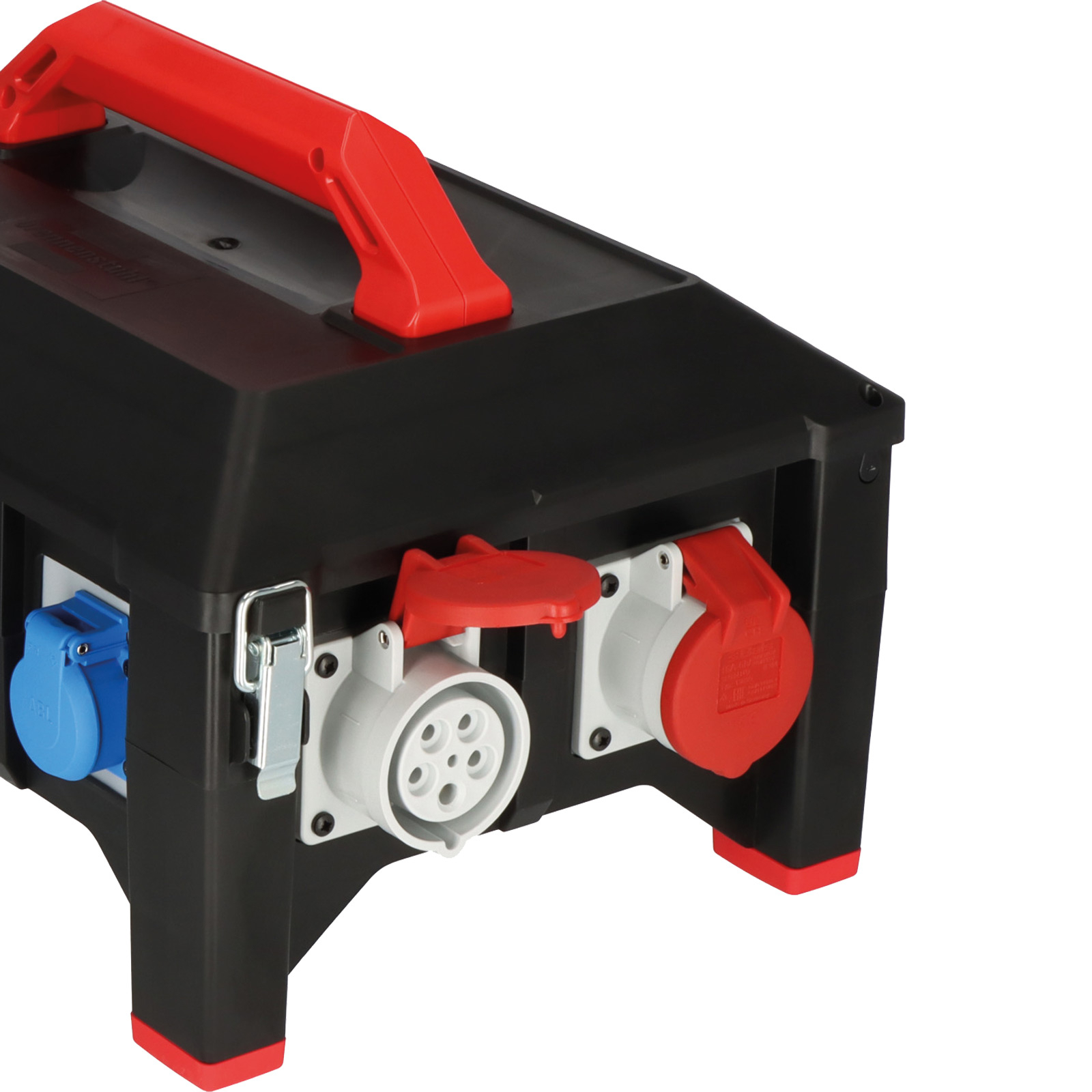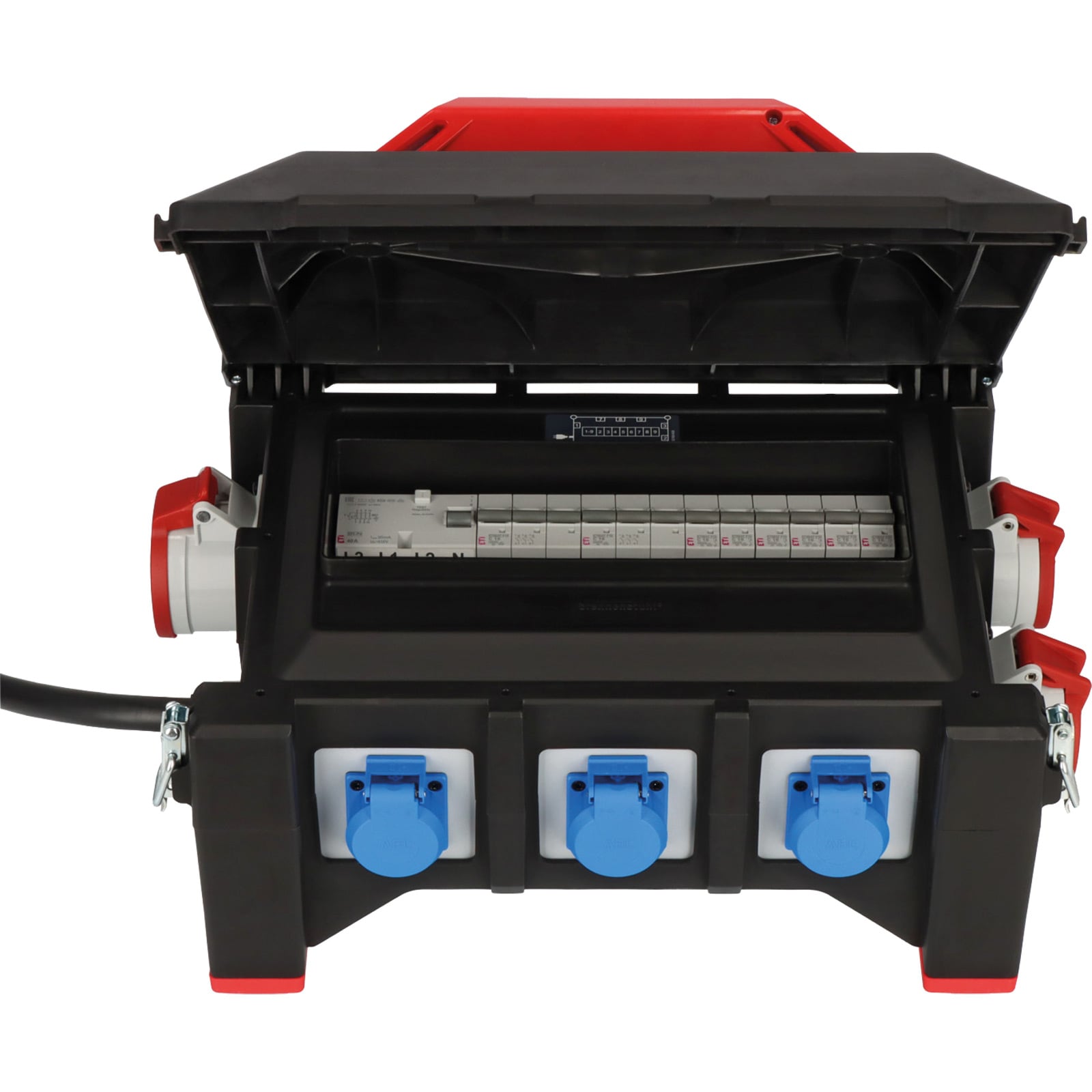 - Gummi-Verteiler mit hoher Betriebssicherheit: FI- und LS-Schalter sind unter dem aufklappbarem Deckel geschützt, FI-Schutzschalter 30mA über alle Ausgänge, zertifizierte Sicherungsautomaten