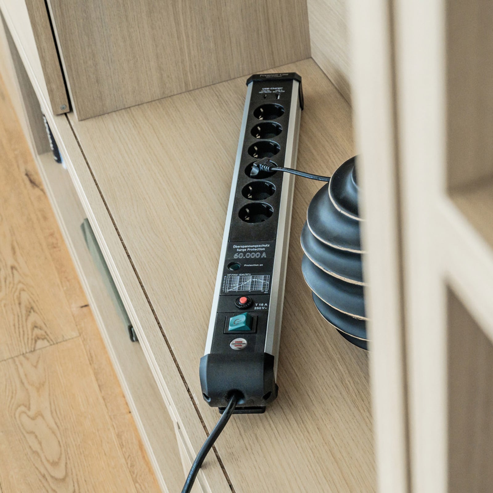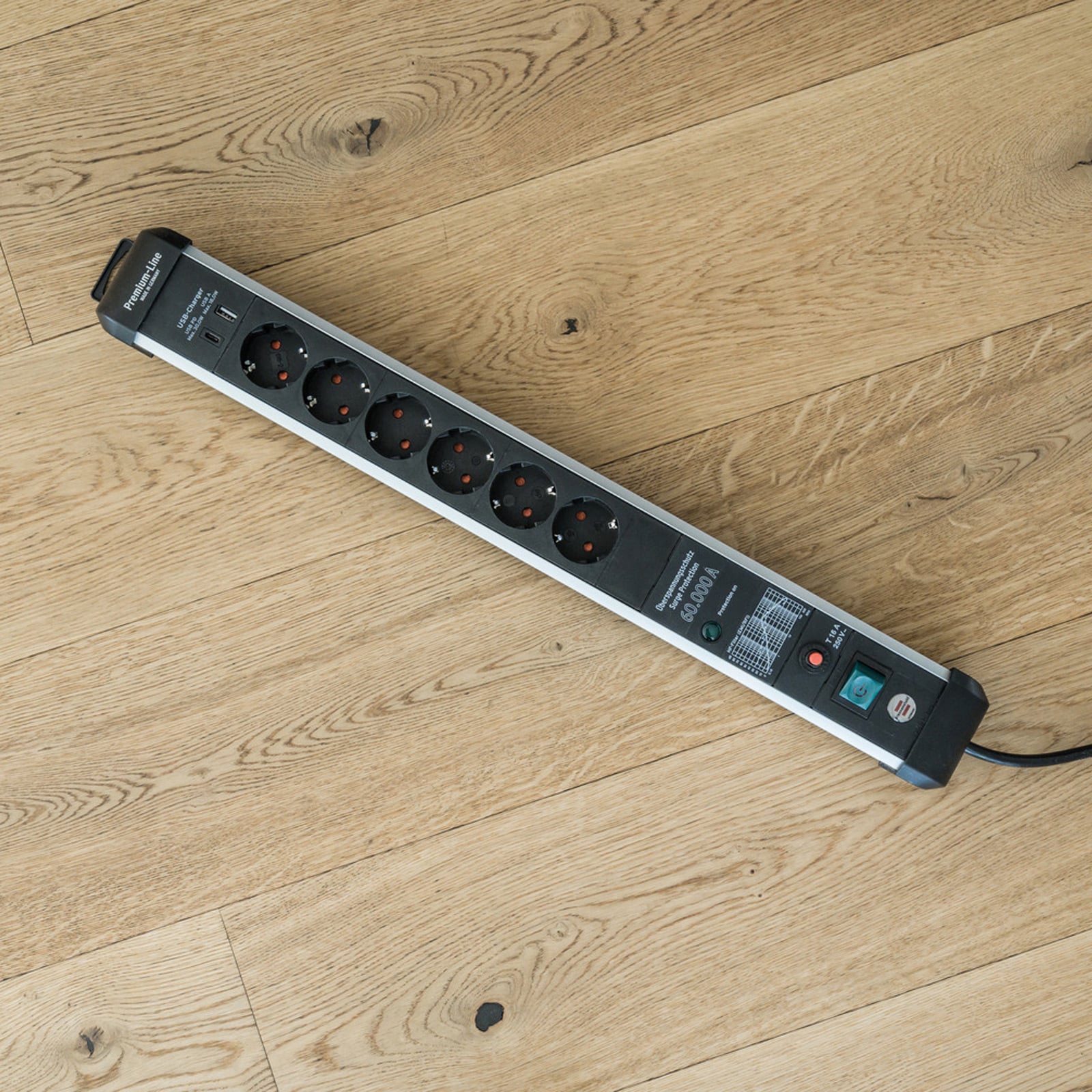 - Steckdosenleiste in besonders stabilem, eloxiertem Aluminium-Gehäuse schützt wertvolle Geräte vor Überspannungen mit einem max. Ableitstrom bis zu 60.000 A (Schutz bei Gewitter, Blitzschlag, etc.)