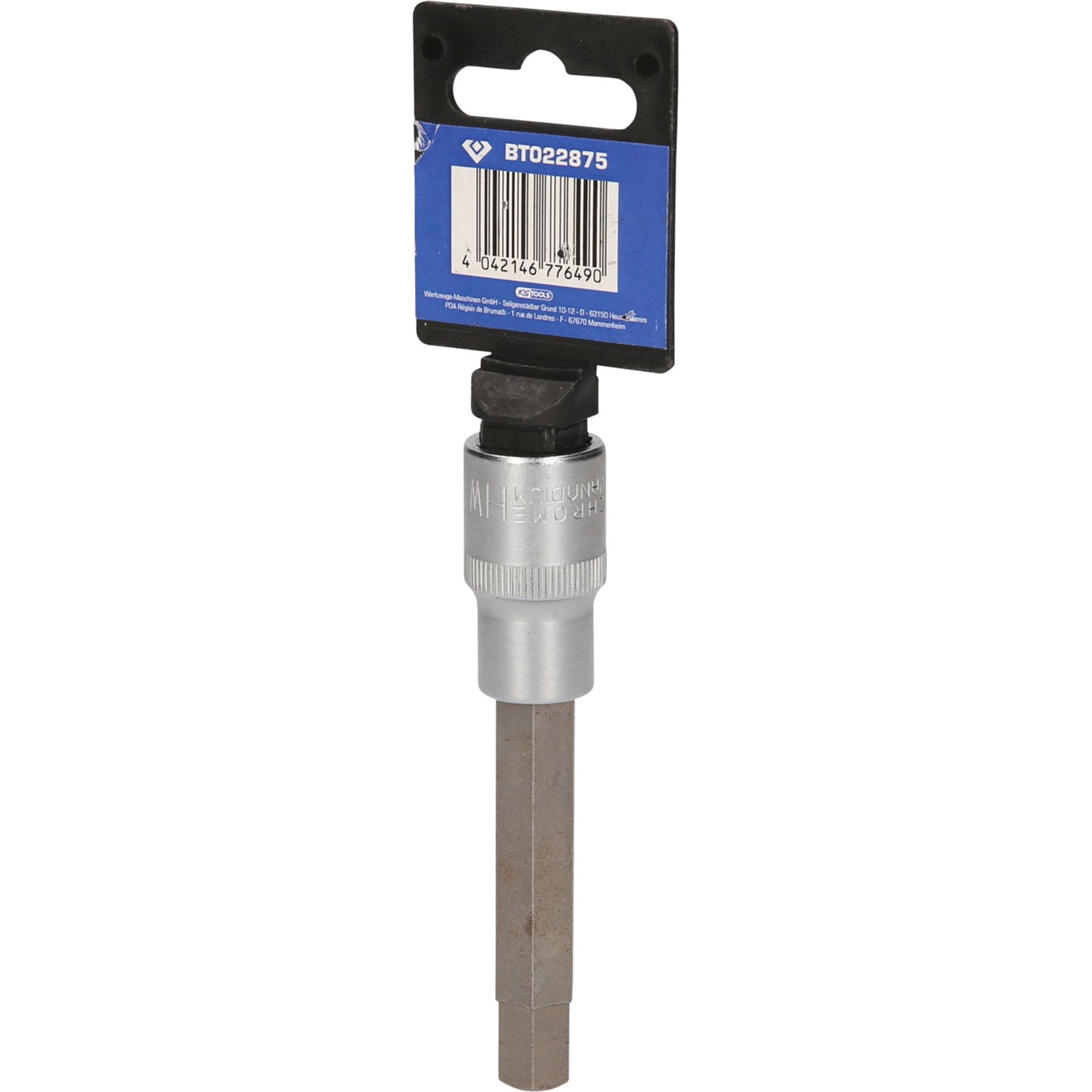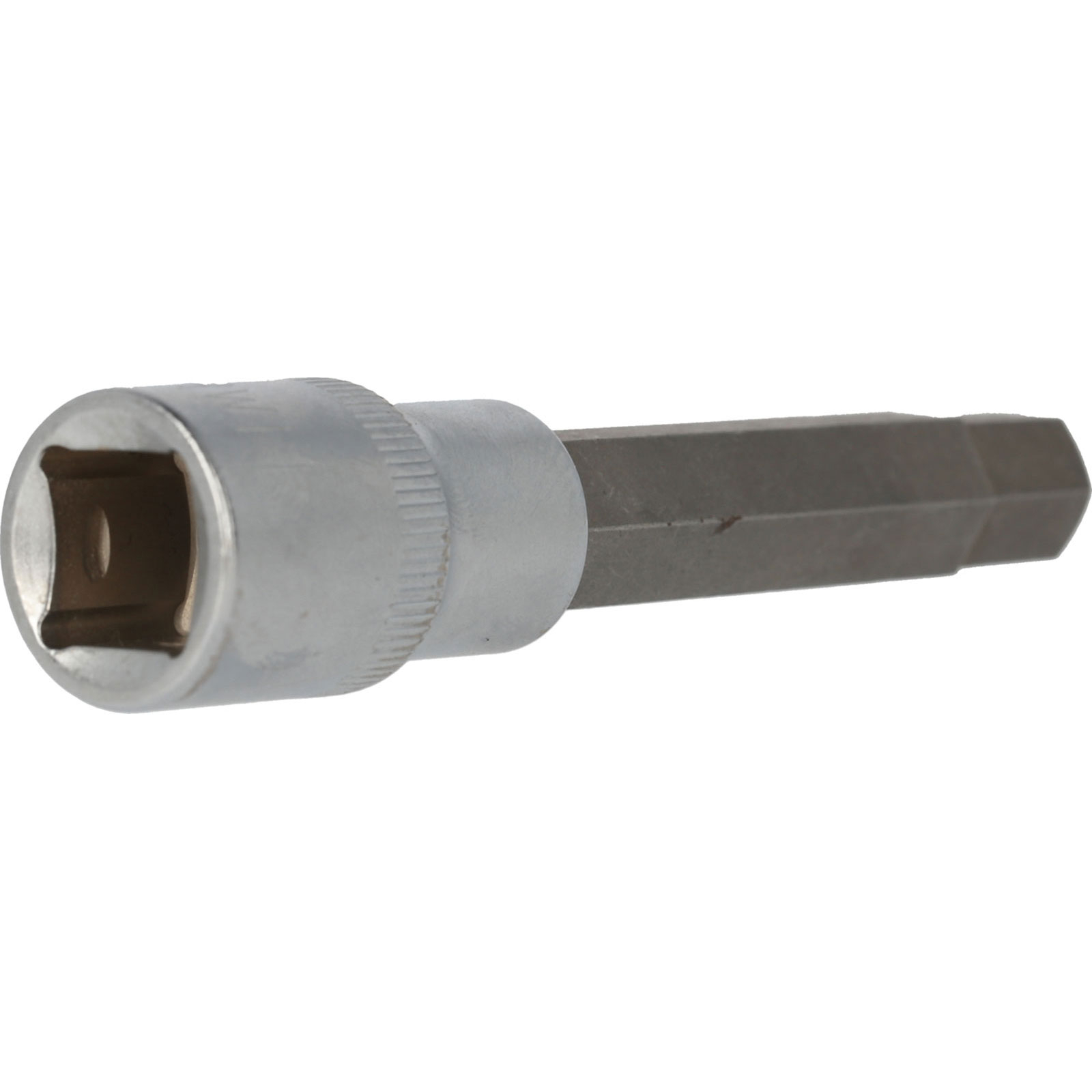 Die BRILLIANT TOOLS Innensechskant-Bit-Stecknuss BT022875 hat einen 1/2" (12,5 mm) Innenvierkant-Antrieb, der nach DIN 3120 gefertigt ist. Der eingepresste phosphatierte Bit hat die Größe 11. Die Bit-Stecknuss hat eine Gesamtlänge von 10 cm und die Klingenlänge beträgt 62 mm. Die Oberfläche ist an der Antriebsseite und an der Bitseite matt verchromt, diese ist durch eine Längsrändelung getrennt.