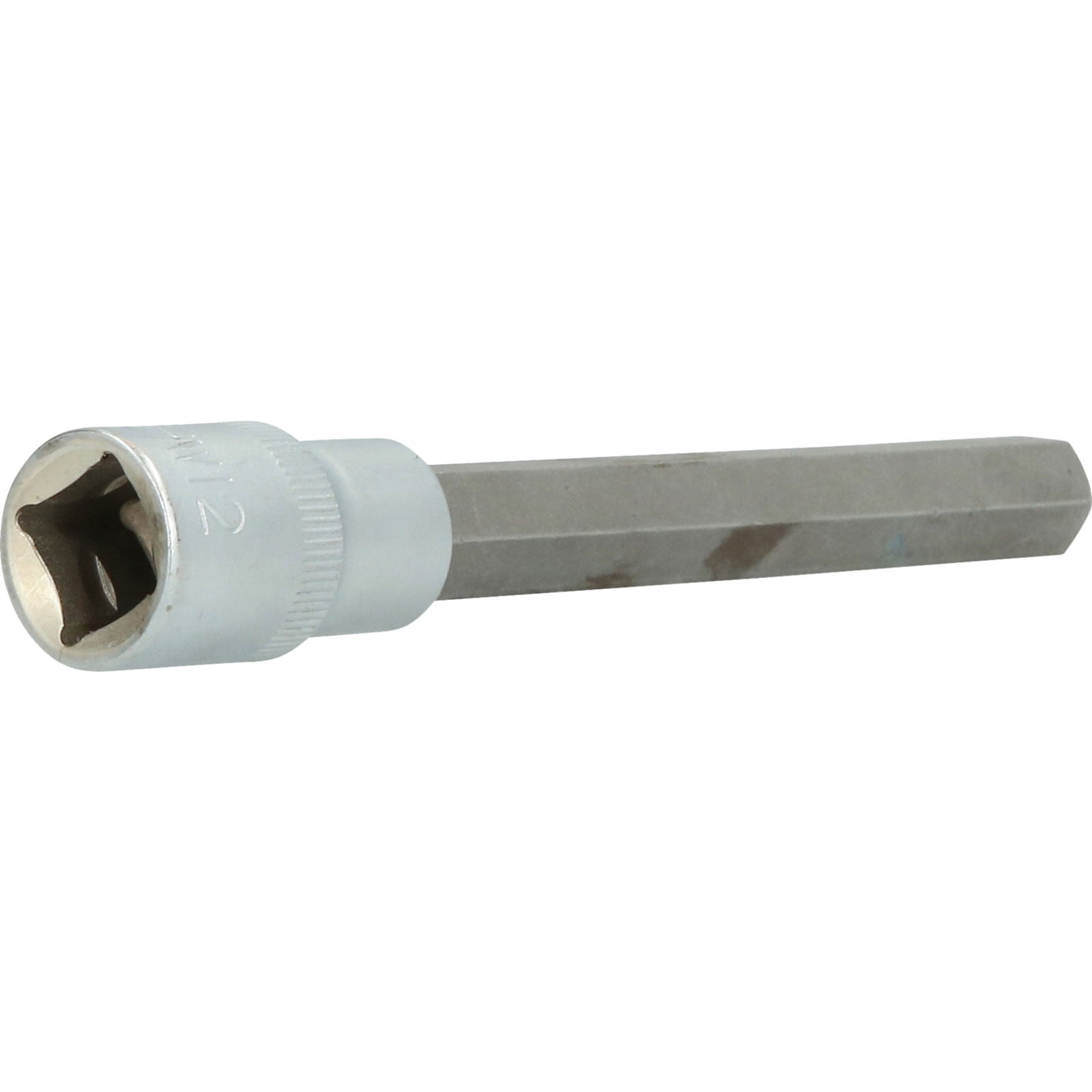 Die BRILLIANT TOOLS Innensechskant-Bit-Stecknuss BT022885 hat einen 1/2" (12,5 mm) Innenvierkant-Antrieb, der nach DIN 3120 gefertigt ist. Der eingepresste phosphatierte Bit hat die Größe 12. Die Bit-Stecknuss hat eine Gesamtlänge von 14 cm und die Klingenlänge beträgt 10,2 cm. Die Oberfläche ist an der Antriebsseite und an der Bitseite matt verchromt, diese ist durch eine Längsrändelung getrennt.