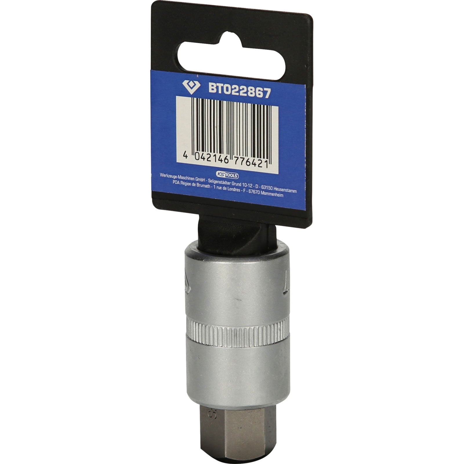 Die BRILLIANT TOOLS Innensechskant-Bit-Stecknuss BT022867 hat einen 1/2" (12,5 mm) Innenvierkant-Antrieb, der nach DIN 3120 gefertigt ist. Der eingepresste phosphatierte Bit hat die Größe 17. Die Bit-Stecknuss hat eine Gesamtlänge von 55 mm, die Klingenlänge beträgt 17 mm. Die Oberfläche ist an der Antriebsseite und an der Bitseite matt verchromt, diese ist durch eine Längsrändelung getrennt.