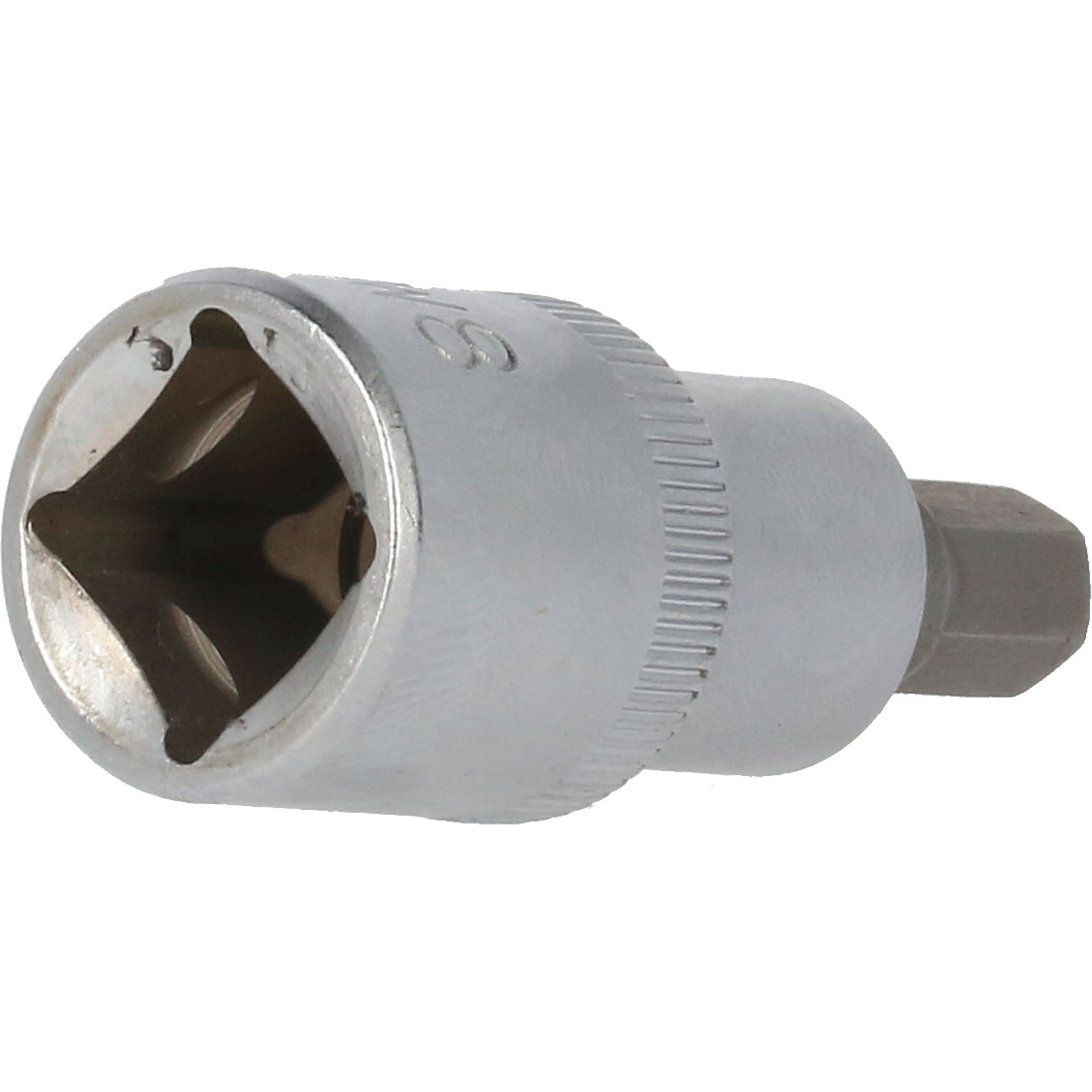 Die BRILLIANT TOOLS Innensechskant-Bit-Stecknuss BT022863 hat einen 1/2" (12,5 mm) Innenvierkant-Antrieb, der nach DIN 3120 gefertigt ist. Der eingepresste phosphatierte Bit hat die Größe 8. Die Bit-Stecknuss hat eine Gesamtlänge von 55 mm, die Klingenlänge beträgt 17 mm. Die Oberfläche ist an der Antriebsseite und an der Bitseite matt verchromt, diese ist durch eine Längsrändelung getrennt.