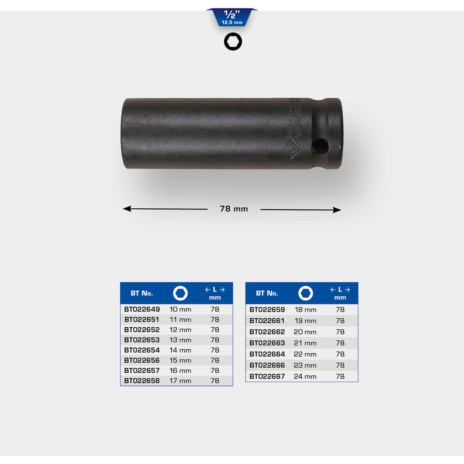 Die BRILLIANT TOOLS Sechskant Kraft-Stecknuss BT022662 hat einen 1/2" (12,5 mm) Innenvierkant-Antrieb, der nach DIN 3121 gefertigt ist. Die Kraft-Stecknuss hat die Schlüsselweite 20 mm und eine Gesamtlänge von 78 mm. Damit sie ist in der Kfz-Werkstatt oder bei Baumaschinen einsetzbar und für den Betrieb mit einem Druckluft- oder Akku Schlagschrauber, Knarre oder Drehmomentschlüssel etc. geeignet. Die Kraft-Stecknuss ist aus qualitativem Chrom-Molybdän-Stahl gefertigt und ist mit einer Aufnahme für einen Verbindungsstift und Gummiring ausgestattet. Die Oberfläche ist phosphatiert und bietet so höchsten Korrosionsschutz.
