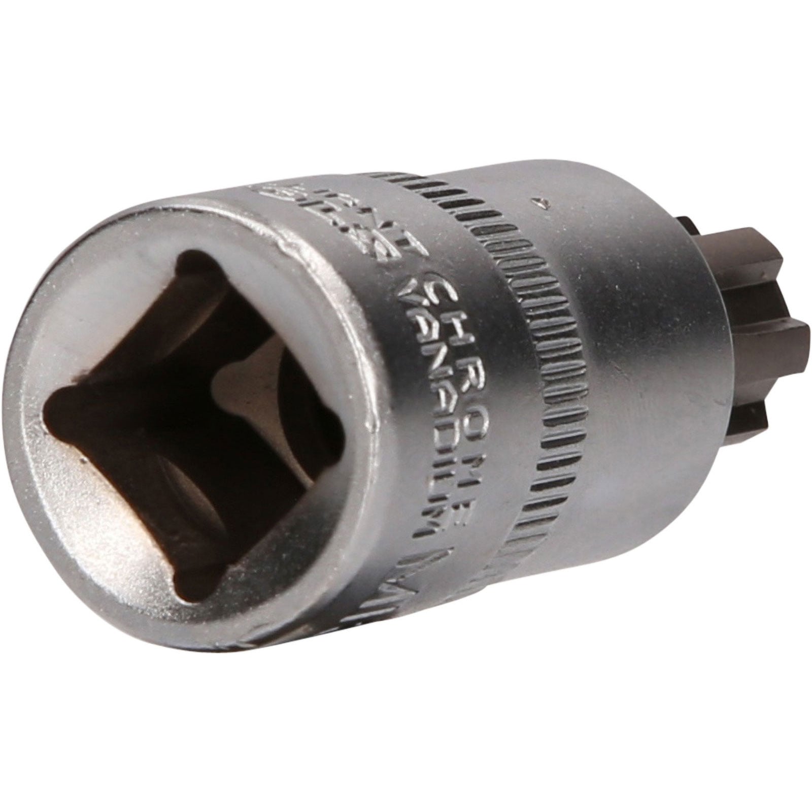 Die BRILLIANT TOOLS RIBE-Bit-Stecknuss BT022727 hat einen 1/2" (12,5 mm) Innenvierkant-Antrieb, der nach DIN 3120 gefertigt ist. Der eingepresste phosphatierte Bit hat die Größe M13. Die Bit-Stecknuss hat eine Gesamtlänge von 55 mm, die Klingenlänge beträgt 17 mm. Die Oberfläche ist an der Antriebsseite und an der Bitseite matt verchromt, diese ist durch eine Längsrändelung getrennt.