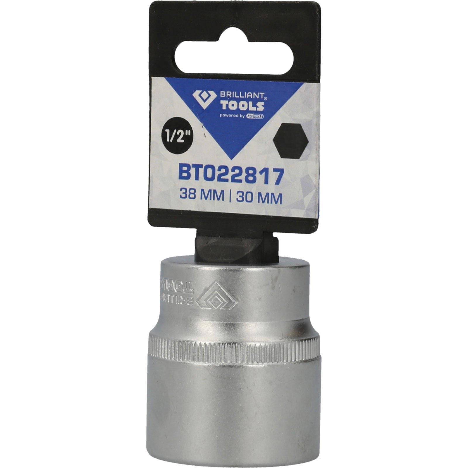 Die BRILLIANT TOOLS Sechskant-Stecknuss BT022817 ist nach DIN 3124 gefertigt. Der kurze metrische Einsatz hat einen 1/2" (12,5 mm) Innenvierkant-Antrieb welcher nach DIN 3120 gefertigt wurde. Die Schlüsselweite des Sechskants ist 30 mm. Die Stecknuss hat eine Gesamtlänge von 38 mm. Die Oberfläche ist an der Antriebsseite und an der Innensechskantseite matt verchromt, diese ist durch eine Längsrändelung getrennt.