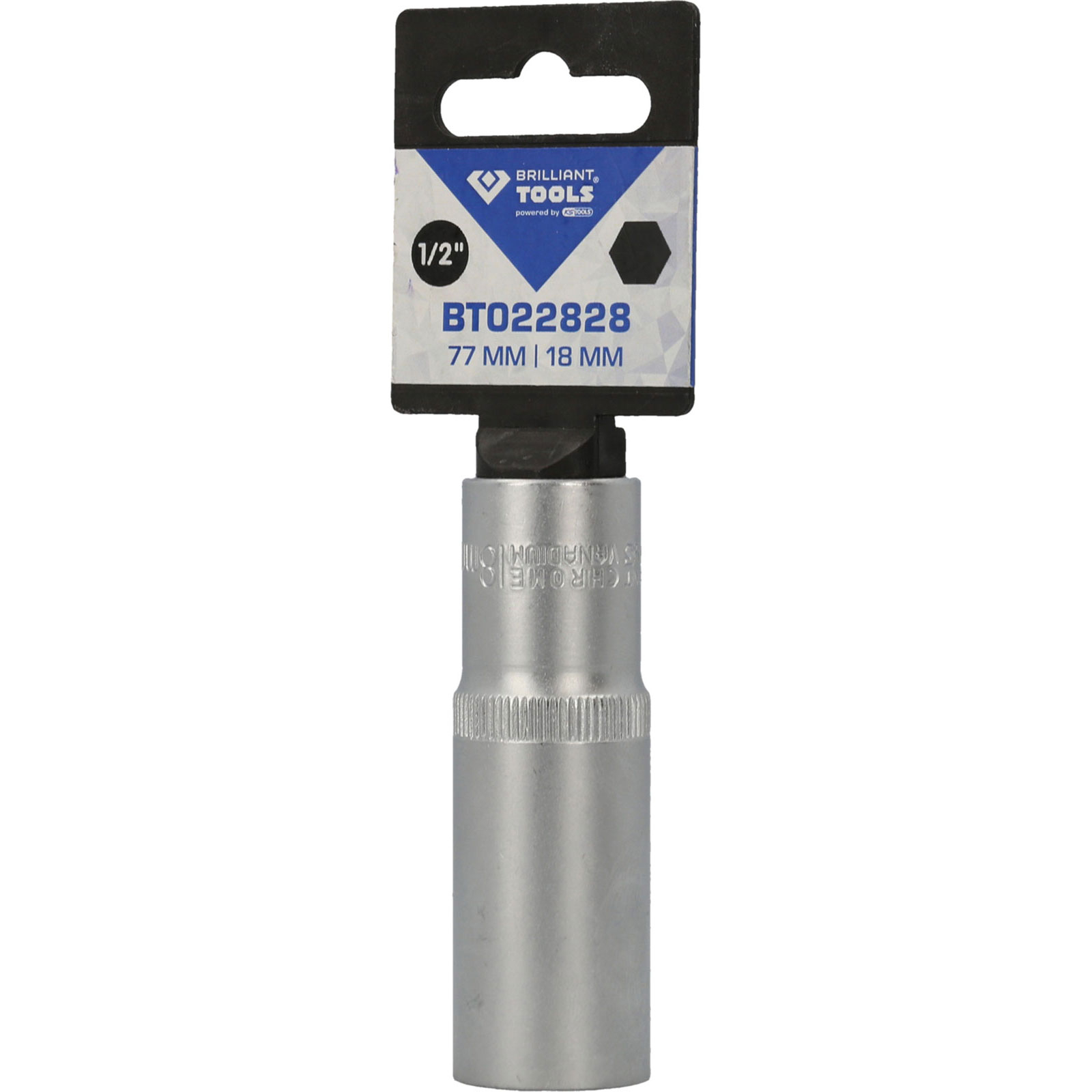 Die BRILLIANT TOOLS Sechskant-Stecknuss BT022828 ist nach DIN 3124 gefertigt. Der lange metrische Einsatz hat einen 1/2" (12,5 mm) Innenvierkant-Antrieb welcher nach DIN 3120 gefertigt wurde. Die Schlüsselweite des Sechskants ist 18 mm. Die Stecknuss hat eine Gesamtlänge von 77 mm. Die Oberfläche ist an der Antriebsseite und an der Innensechskantseite matt verchromt, diese ist durch eine Längsrändelung getrennt.
