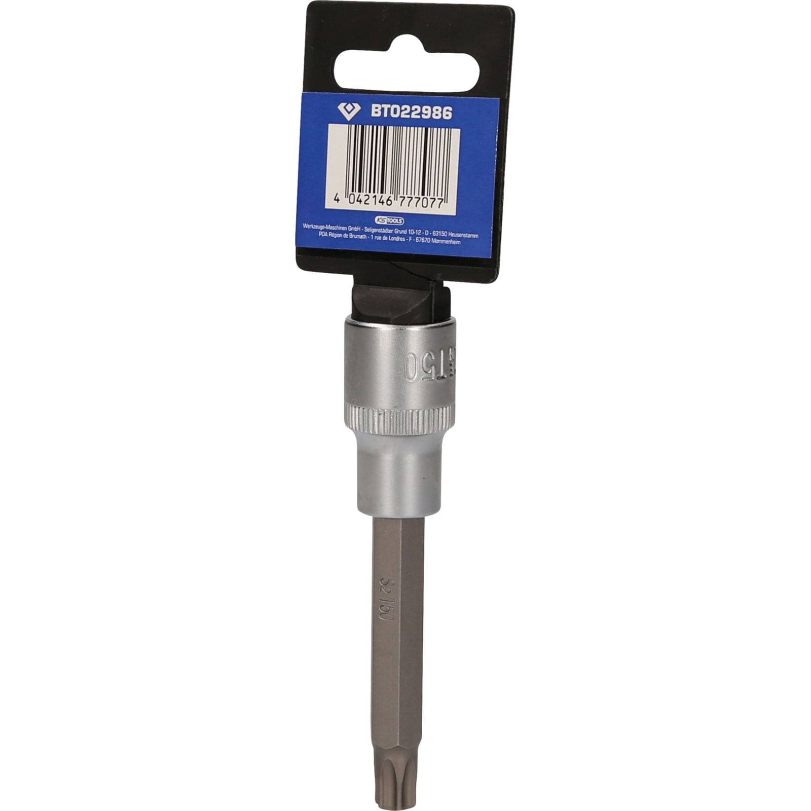Die BRILLIANT TOOLS Torx-Bit-Stecknuss BT022986 hat einen 1/2" (12,5 mm) Innenvierkant-Antrieb, der nach DIN 3120 gefertigt ist. Der eingepresste phosphatierte Bit hat die Größe T50. Die Bit-Stecknuss hat eine Gesamtlänge von 10 cm und die Klingenlänge beträgt 62 mm. Die Oberfläche ist an der Antriebsseite und an der Bitseite matt verchromt, diese ist durch eine Längsrändelung getrennt.