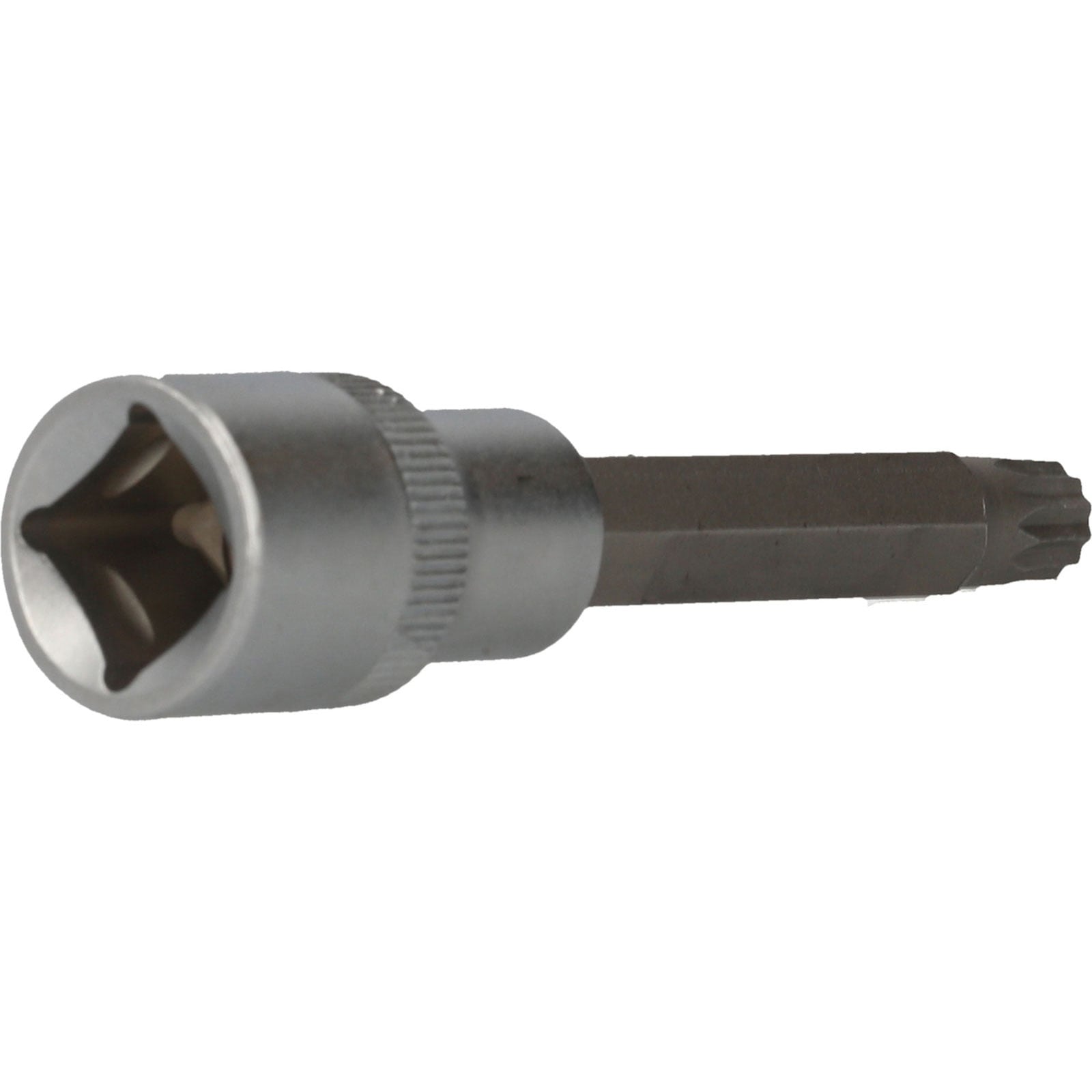 Die BRILLIANT TOOLS Vielzahn-Bit-Stecknuss BT022943 hat einen 1/2" (12,5 mm) Innenvierkant-Antrieb, der nach DIN 3120 gefertigt ist. Der eingepresste phosphatierte Bit hat die Größe M9. Die Bit-Stecknuss hat eine Gesamtlänge von 10 cm und die Klingenlänge beträgt 62 mm. Die Oberfläche ist an der Antriebsseite und an der Bitseite matt verchromt, diese ist durch eine Längsrändelung getrennt.