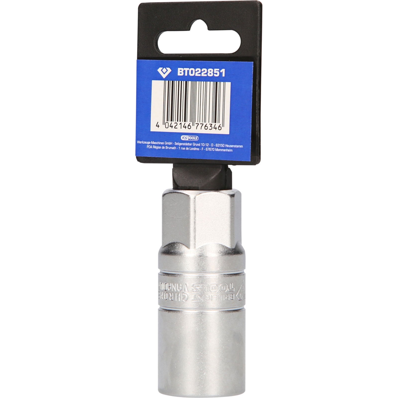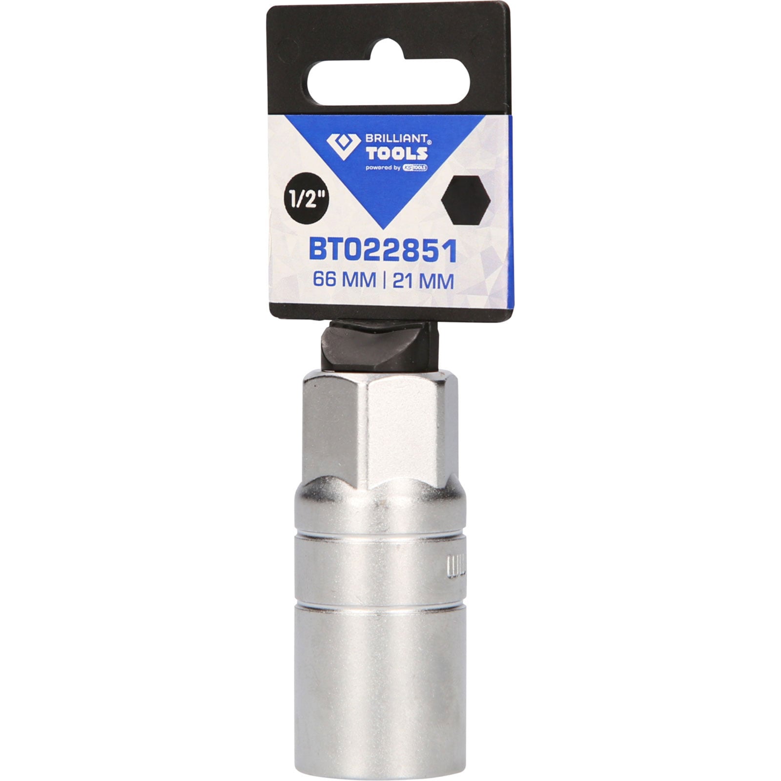 Die BRILLIANT TOOLS Zündkerzen-Stecknuss BT022851 ist nach DIN 3124 gefertigt. Der lange metrische Einsatz hat einen 1/2" (12,5 mm) Innenvierkant-Antrieb nach DIN 3120 gefertigt, mit einem Gummieinsatz zum Halten der Zündkerze. Die Schlüsselweite des Sechskants beträgt 21 mm. Der Steckschlüsseleinsatz hat eine Gesamtlänge von 66 mm. Die Oberfläche ist an der Antriebsseite und an der Innensechskantseite matt verchromt, diese ist durch eine Längsrändelung getrennt. Er ist nur für den Handbetrieb geeignet.