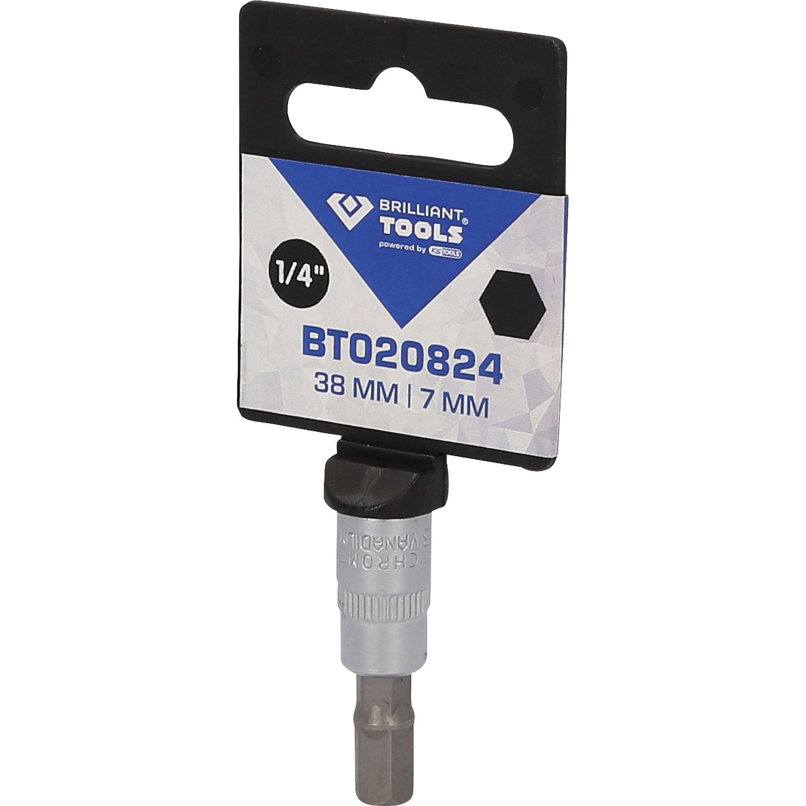 Die BRILLIANT TOOLS Innensechskant Bit-Stecknuss BT020824 hat einen 1/4" (6,3 mm) Innenvierkant-Antrieb, der nach DIN 3120 gefertigt ist. Der eingepresste phosphatierte Bit hat die Größe 7. Die Bit-Stecknuss hat eine Gesamtlänge von 38 mm, die Klingenlänge beträgt 17 mm. Die Oberfläche ist an der Antriebsseite und an der Bitseite matt verchromt, diese ist durch eine Längsrändelung getrennt.