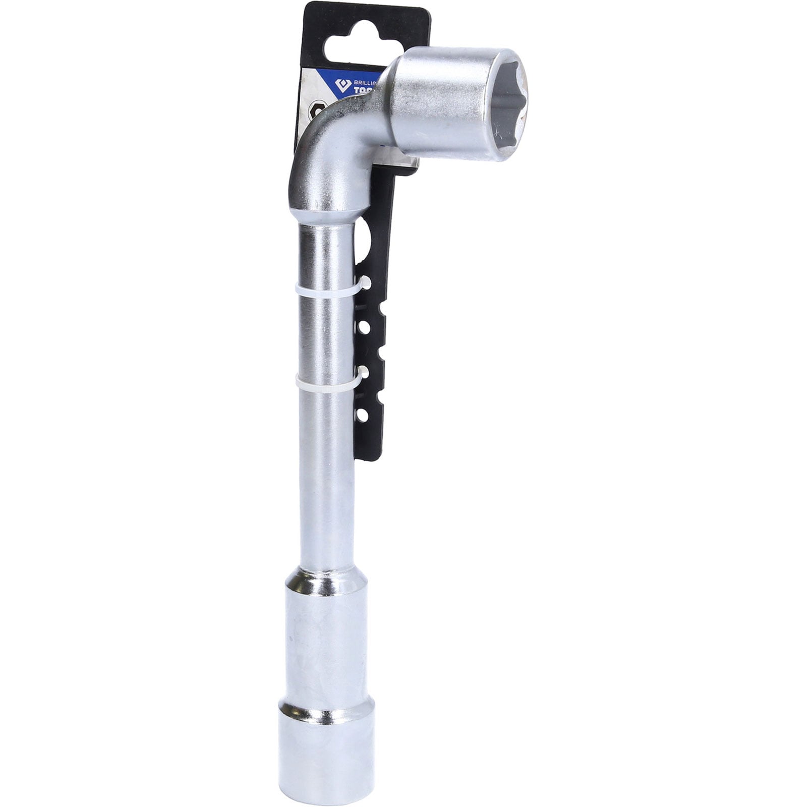 Der BRILLIANT TOOLS Doppel-Steckschlüssel BT015024 wird aus Chrom Vanadium Stahl im Gesenk geschmiedet und anschließend gehärtet. Der metrische Doppel-Steckschlüssel ist auf einer Seite um 90° gekröpft, um auch tiefer liegende Schraubfälle spielend leicht zu lösen. Die Oberfläche ist für einen verbesserten Rostschutz verchromt und nach DIN 838 gefertigt, dadurch sitzt er auch besonders gut in der Hand. Besonders geeignet ist dieser Schlüssel für Stehbolzen und tiefliegende Muttern. Die kurze Seite ist gebohrt zum Einstecken von Drehstiften.