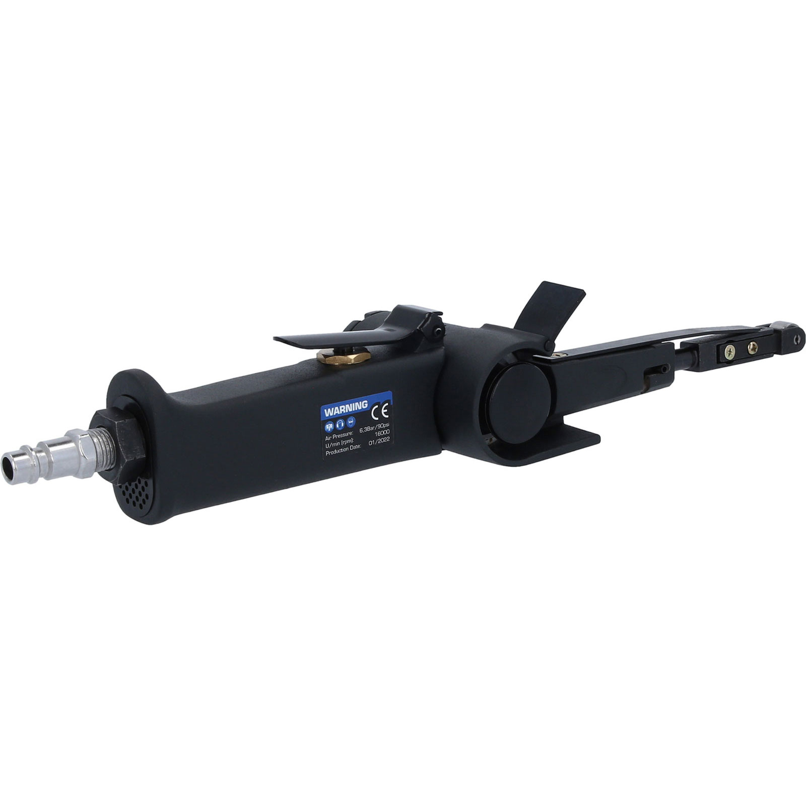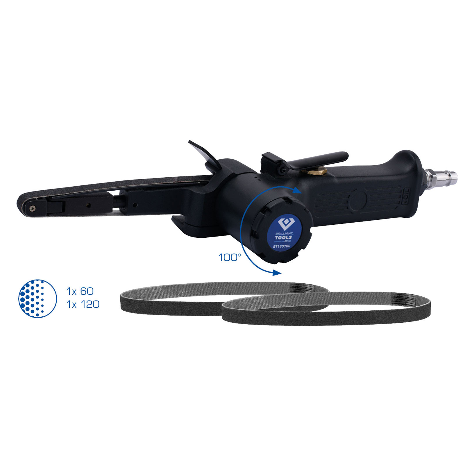 Der BRILLIANT TOOLS Druckluft-Bandschleifer BT160706 zeichnet sich durch sein geringes Gewicht, hohe Sicherheit, Geschwindigkeit und Effizienz sowie durch bequeme Anwendung aus. Ausgestattet mit einem um 100 Grad verstellbaren Schleifkopf eignet sich dieser Druckluft-Bandschleifer perfekt für schnelles und gründliches Schleifen von kleinen Flächen an schwer zugänglichen Stellen, wie z.B. von Schweißschlacken, Schweißverbindungen, groben Werkstückkanten oder zum Reinigen von Bremssätteln beim Wechseln der Bremsbeläge, etc. Der Druckluft-Bandschleifer wird mit 2 Bändern mit 60-er und 120-er Körnung geliefert, die ohne Werkzeug schnell ausgetauscht und durch Federkraft automatisch gespannt werden können, was eine sichere Bandführung gewährleistet.
