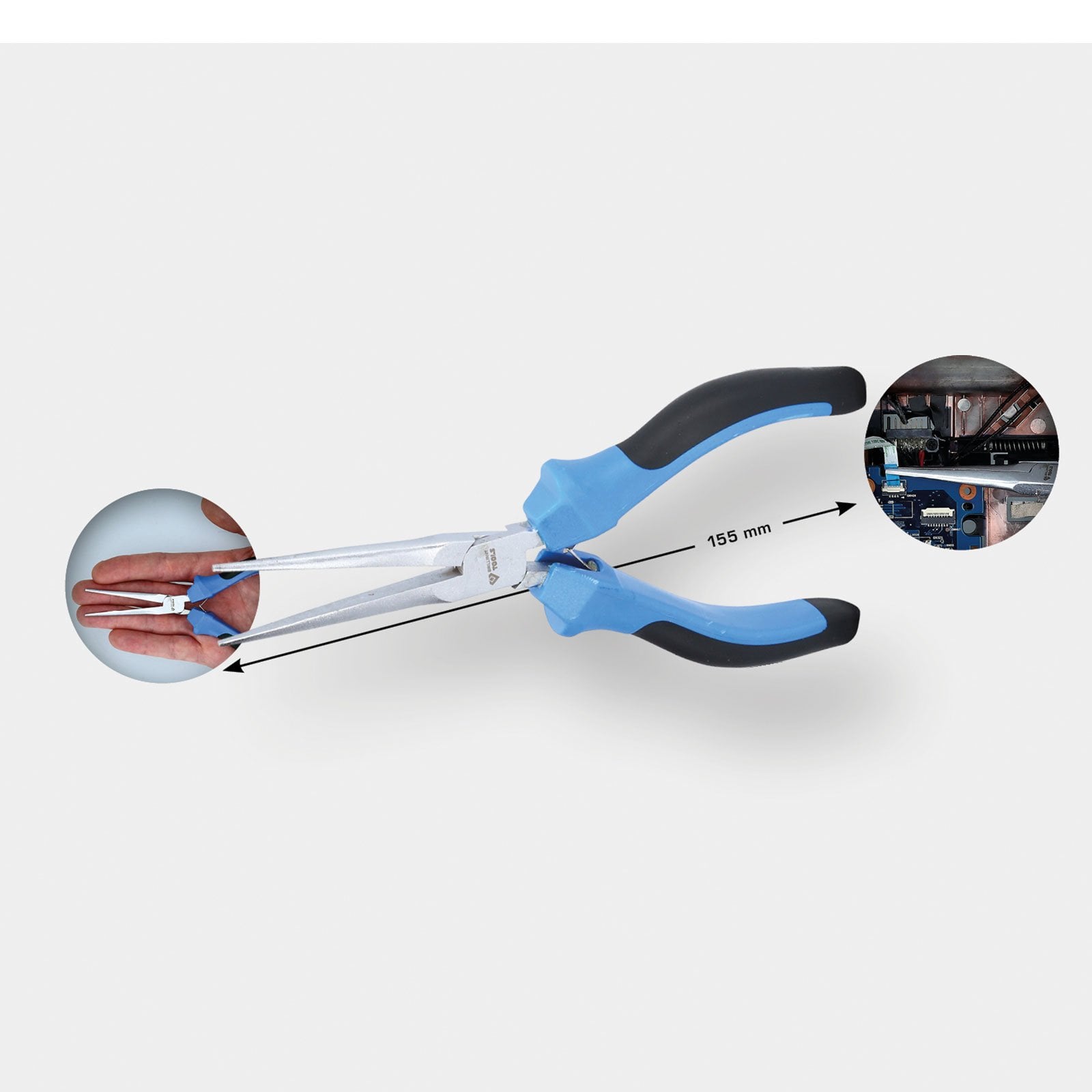Die BRILLIANT TOOLS Feinmechanik-Telefonzange BT067606 ist ideal zum Greifen und Halten bei Richt- und Biegearbeiten in der Elektronik oder dem Modellbau. Der extra lange Zangenkopf ermöglicht das Einführen von tiefliegenden Bauteilen. Die Telefonzange hat eine Gesamtlänge von 16,0 cm, ist elektrisch ableitend und hat induktiv gehärtete Präzisionsschneiden, die auch für Draht geeignet sind. Die selbstöffnende Doppelfeder sorgt für entlastendes Arbeiten im Dauereinsatz. Der 2-Komponentengriff liegt gut in der Hand und ermöglicht so präzise Kraftübertragung.