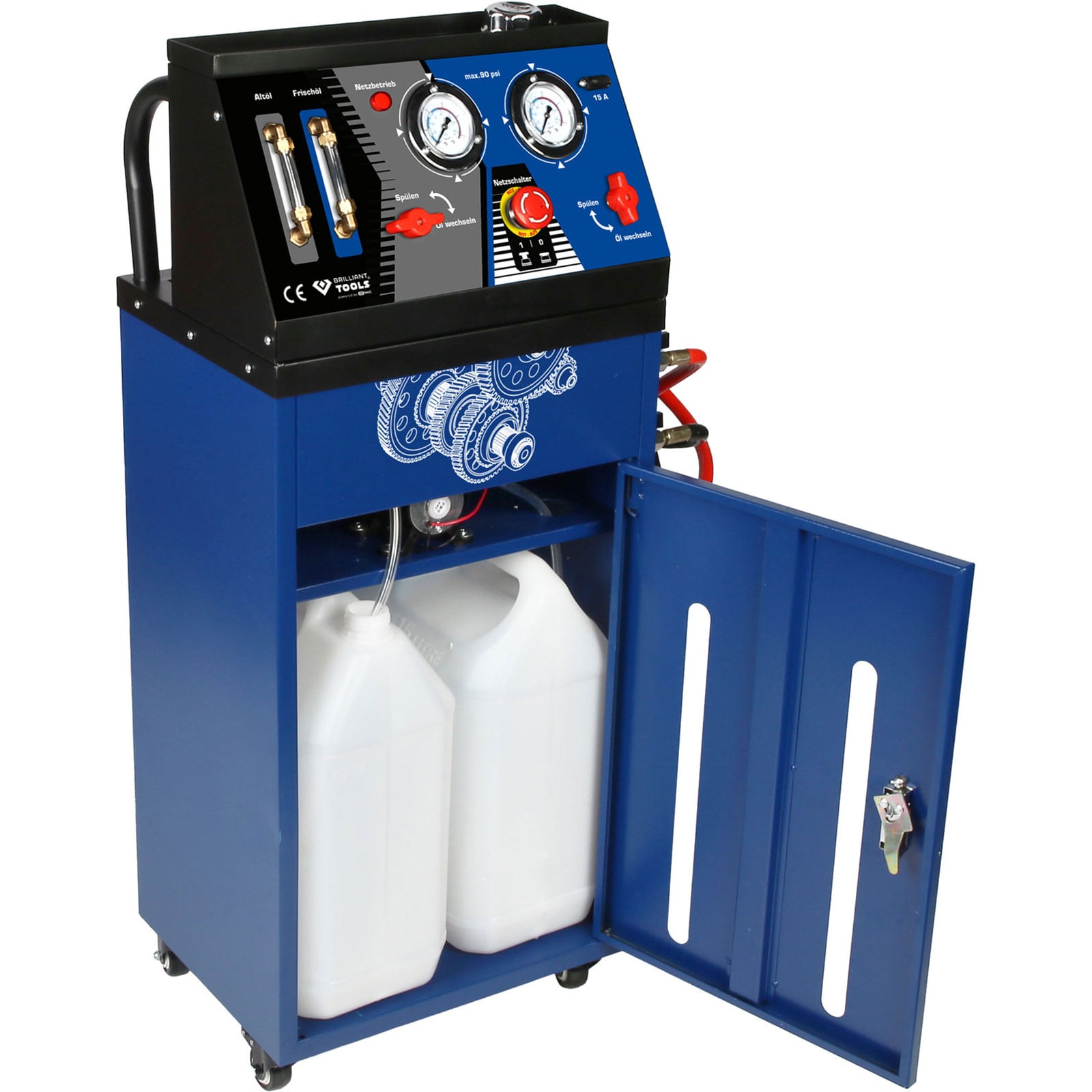 Das BRILLIANT TOOLS Getriebespülgerät BT626050 reinigt und tauscht die Flüssigkeit im Getriebe, Drehmomentwandler und Kühler in nur ca. 20 Minuten aus. Beim Austausch der Flüssigkeit werden der Flüssigkeitsdruck vom A/F-Kühler und der Flüssigkeitsauslassdruck des Gerätes angezeigt. Die verschiedenen Öle bleiben im Inneren des Gerätes vollständig getrennt und können sich nicht vermischen. Es können beide Arbeiten gleichzeitig durchgeführt werden - eine Zeitersparnis von 50%! Der mitgelieferte Adapter-Satz enthält diverse Adapter für zum Beispiel: Audi, Seat, Skoda, VW, BMW, Peugeot, Land Rover, Ford, Toyota, Mercedes