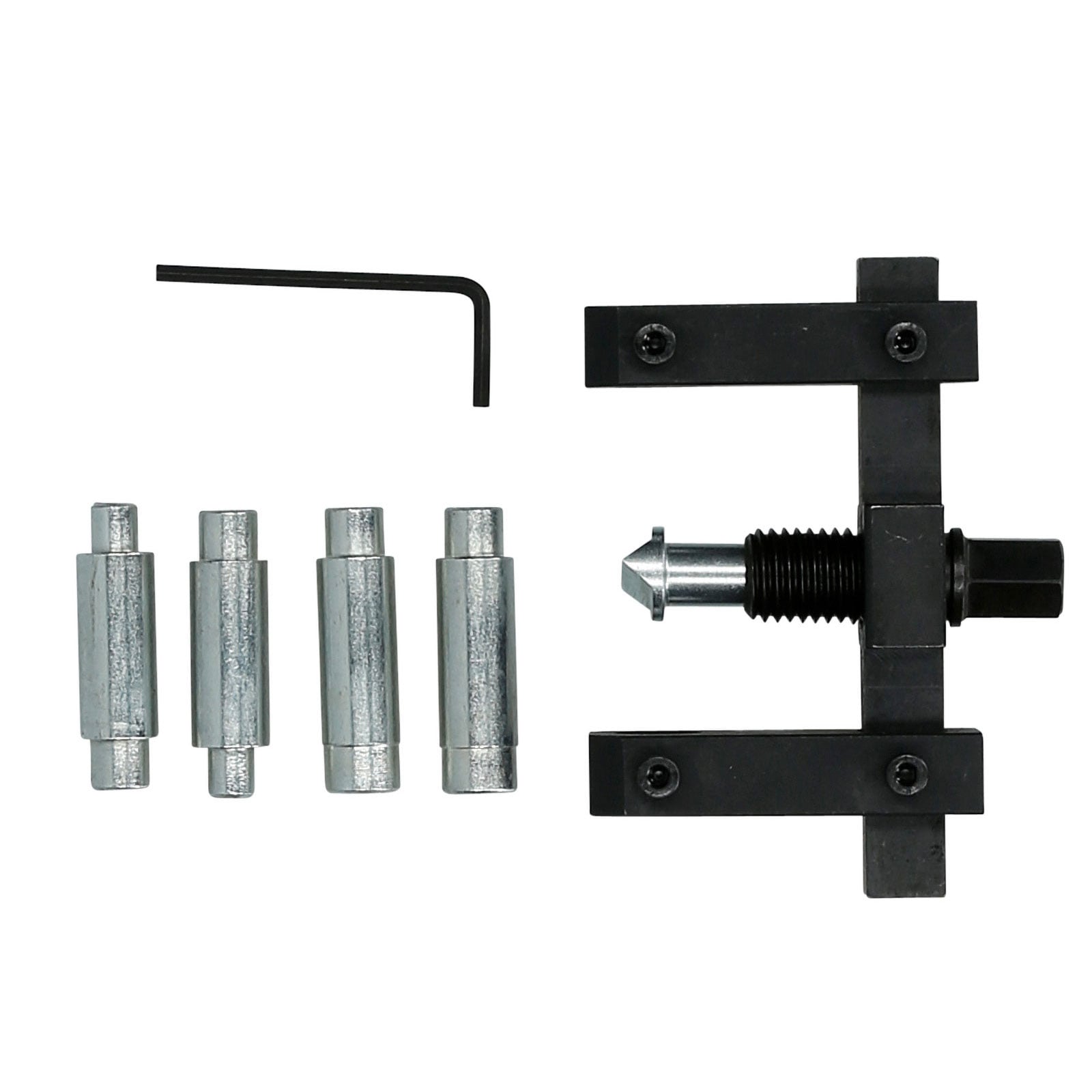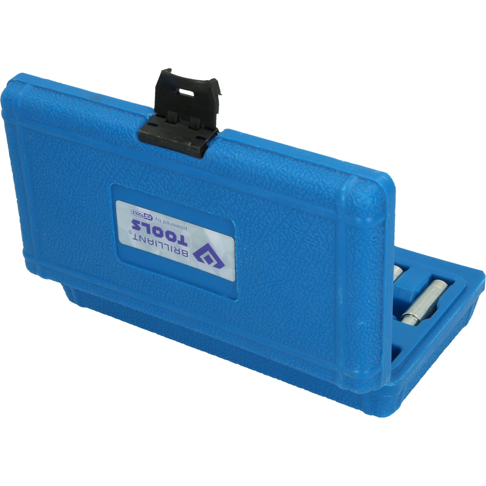 Der BRILLIANT TOOLS Klemm und Spreizwerkzeug-Satz BT6613000 ist mit 2 wechselbaren Spreiz-Einsätzen (5 und 8 mm Tiefe) für unterschiedliche Spreizwinkel ausgestattet. Die Führungsbolzen (8, 10 und 12 mm) sind zum Beispiel für die Stoßdämpferaufnahme am Radlagergehäuse, beim Dämpferwechsel der Kugelgelenkaufnahme am Quer-/ Dreieckslenker, bei Demontage des Federbeines geeignet. Durch die optimale Fixierung des Werkzeuges mit Bolzen, die in die Schraubenlöcher gesteckt werden, ist ein Abrutschen nahezu unmöglich. Über eine Spindel mit 13 mm Außensechskant wird der Spreizer in die Öffnung gedrückt. Ein Schlagen mit Hammer ist nicht mehr nötig. Somit wird die Gefahr von Materialermüdung oder –bruch, gerade bei Alu-Lenkungsteilen, verringert.