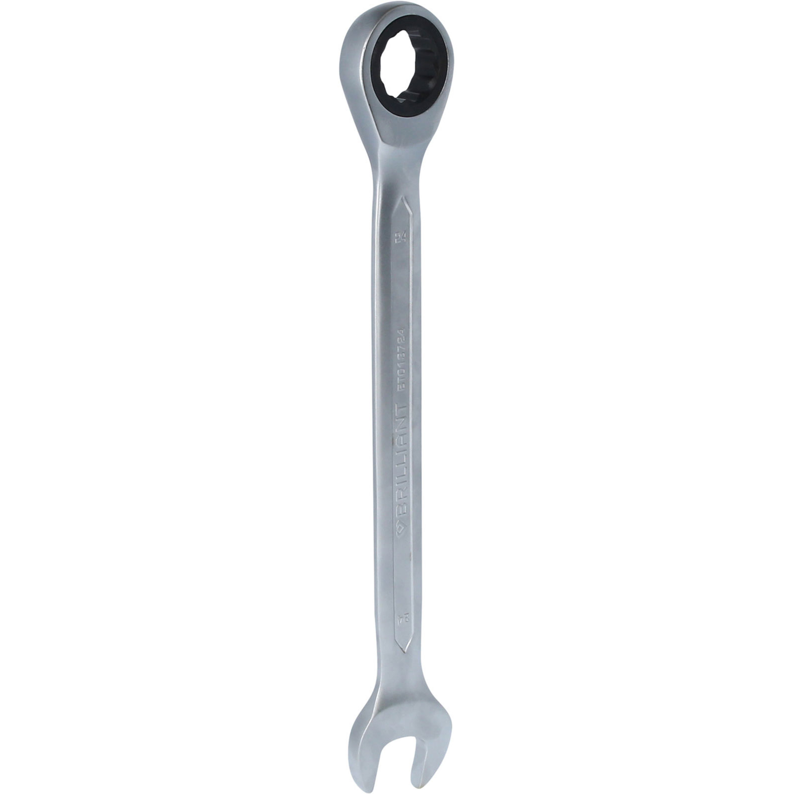 Der BRILLIANT TOOLS Ratschenringschlüssel BT013724 wird in Anlehnung an DIN 3113 gefertigt. Der metrische Ringschlüssel mit Ratschenfunktion ist feinverzahnt mit 72 Zähnen und hat einen Rückschwenkwinkel von 5°. Der Schlüssel hat eine Gesamtlänge von 33,5 cm und eine gerade Form. Die Maulstellung ist um 15° abgewinkelt. Eine Umstellung der Ratschenfunktion (rechts / links) erfolgt durch Umdrehen des Schlüssels. Die Oberfläche ist matt verchromt, dadurch liegt er besonders gut in der Hand und ermöglicht so eine optimale Kraftübertragung.