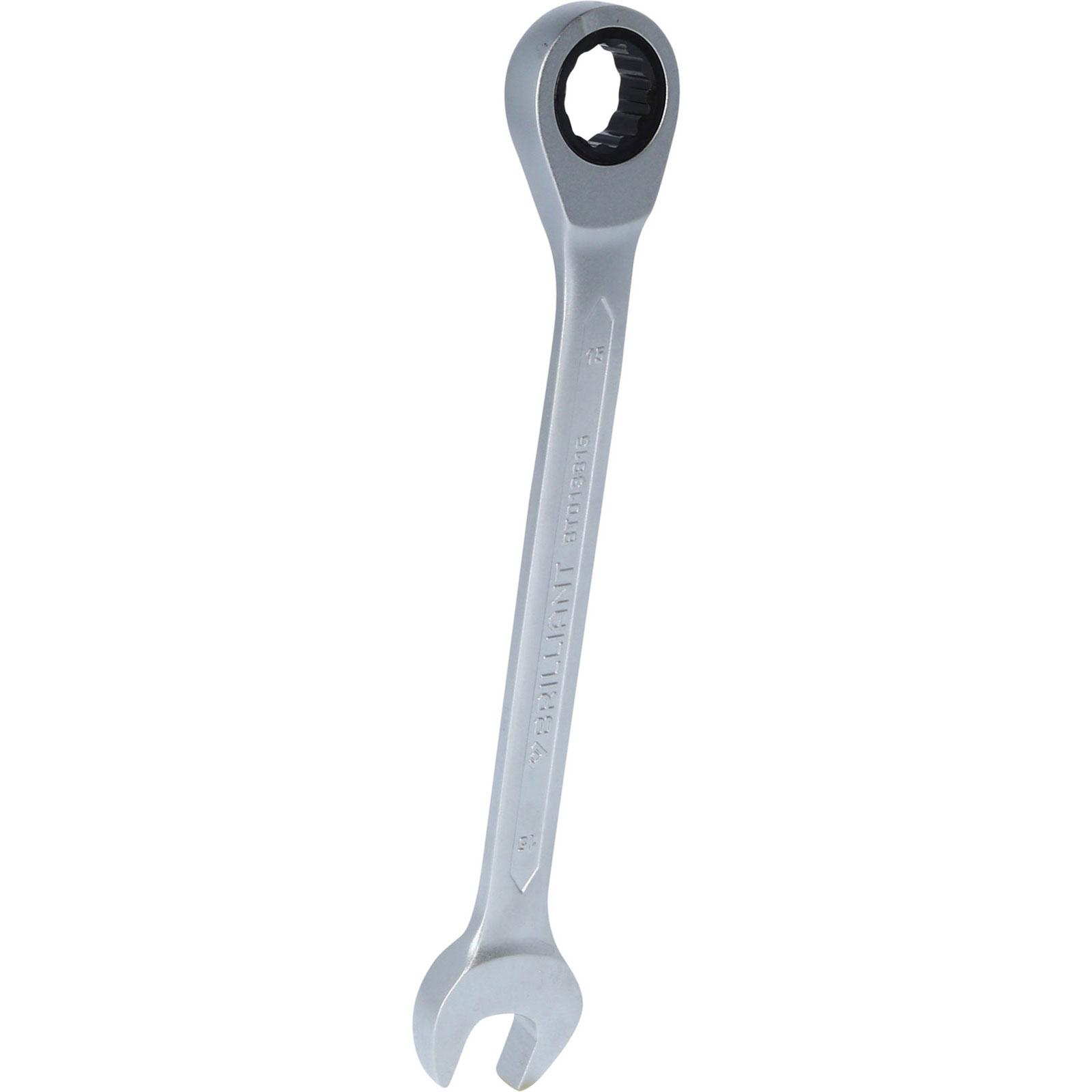 Der BRILLIANT TOOLS Ratschenringschlüssel BT013815 wird in Anlehnung an DIN 3113 gefertigt. Der metrische Ringschlüssel mit Ratschenfunktion ist feinverzahnt mit 72 Zähnen und hat einen Rückschwenkwinkel von 5°. Der Schlüssel hat eine Gesamtlänge von 20 cm und einen umschaltbaren Ratschenkopf, der um 15° abgewinkelt ist. Die Maulstellung ist ebenfalls um 15° abgewinkelt. Eine Umstellung der Ratschenfunktion (rechts / links) erfolgt komfortabel durch Bewegen des Umschalters. Die Oberfläche ist matt verchromt, dadurch liegt er besonders gut in der Hand und ermöglicht so eine optimale Kraftübertragung.
