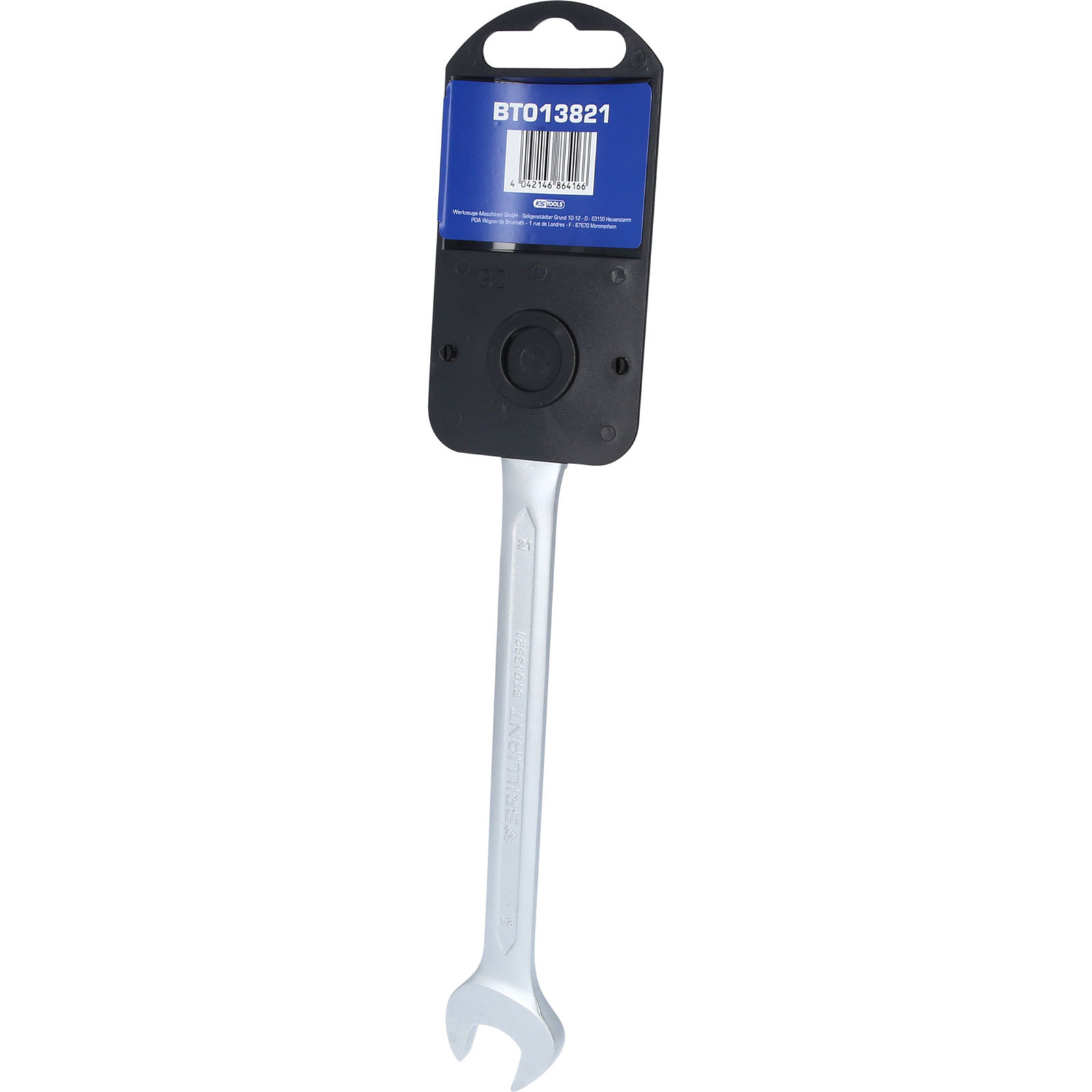 Der BRILLIANT TOOLS Ratschenringschlüssel BT013821 wird in Anlehnung an DIN 3113 gefertigt. Der metrische Ringschlüssel mit Ratschenfunktion ist feinverzahnt mit 72 Zähnen und hat einen Rückschwenkwinkel von 5°. Der Schlüssel hat eine Gesamtlänge von 28,5 cm und einen umschaltbaren Ratschenkopf, der um 15° abgewinkelt ist. Die Maulstellung ist ebenfalls um 15° abgewinkelt. Eine Umstellung der Ratschenfunktion (rechts / links) erfolgt komfortabel durch Bewegen des Umschalters. Die Oberfläche ist matt verchromt, dadurch liegt er besonders gut in der Hand und ermöglicht so eine optimale Kraftübertragung.