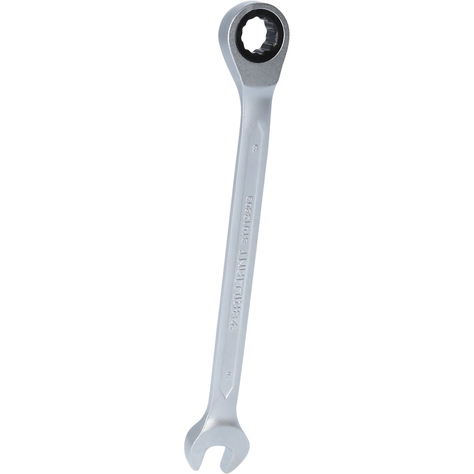 Der BRILLIANT TOOLS Ratschenringschlüssel BT013809 wird in Anlehnung an DIN 3113 gefertigt. Der metrische Ringschlüssel mit Ratschenfunktion ist feinverzahnt mit 72 Zähnen und hat einen Rückschwenkwinkel von 5°. Der Schlüssel hat eine Gesamtlänge von 14,5 cm und einen umschaltbaren Ratschenkopf, der um 15° abgewinkelt ist. Die Maulstellung ist ebenfalls um 15° abgewinkelt. Eine Umstellung der Ratschenfunktion (rechts / links) erfolgt komfortabel durch Bewegen des Umschalters. Die Oberfläche ist matt verchromt, dadurch liegt er besonders gut in der Hand und ermöglicht so eine optimale Kraftübertragung.