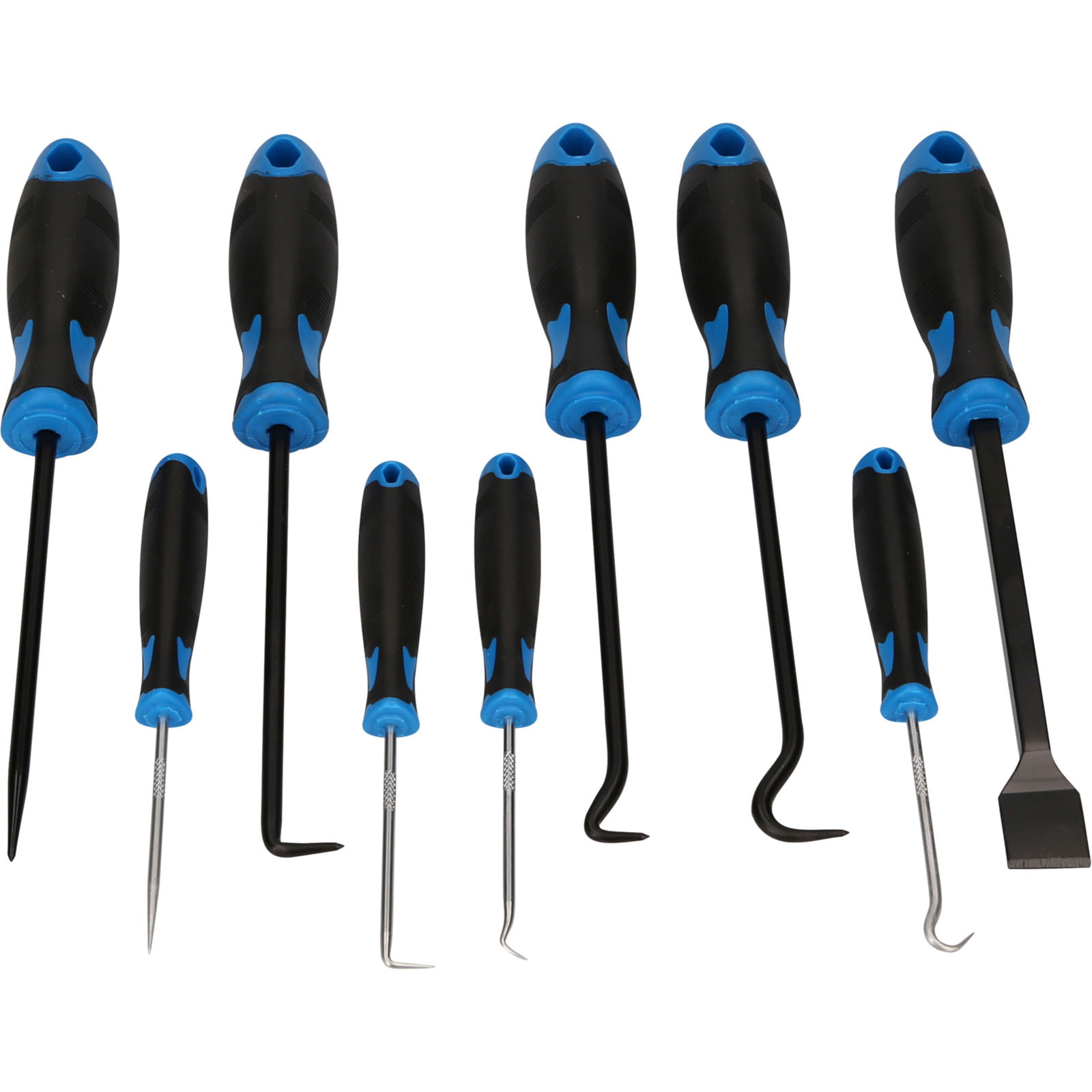 Der BRILLIANT TOOLS Schaber-Haken-Werkzeug-Satz, 9-tlg. BT542010 enthält Schaber, Locher und Haken in verschiedenen Winkeln.