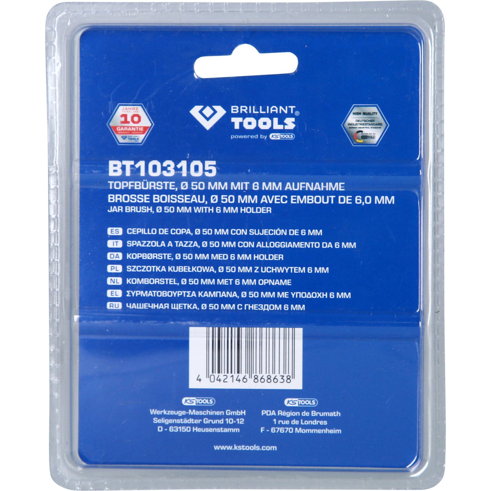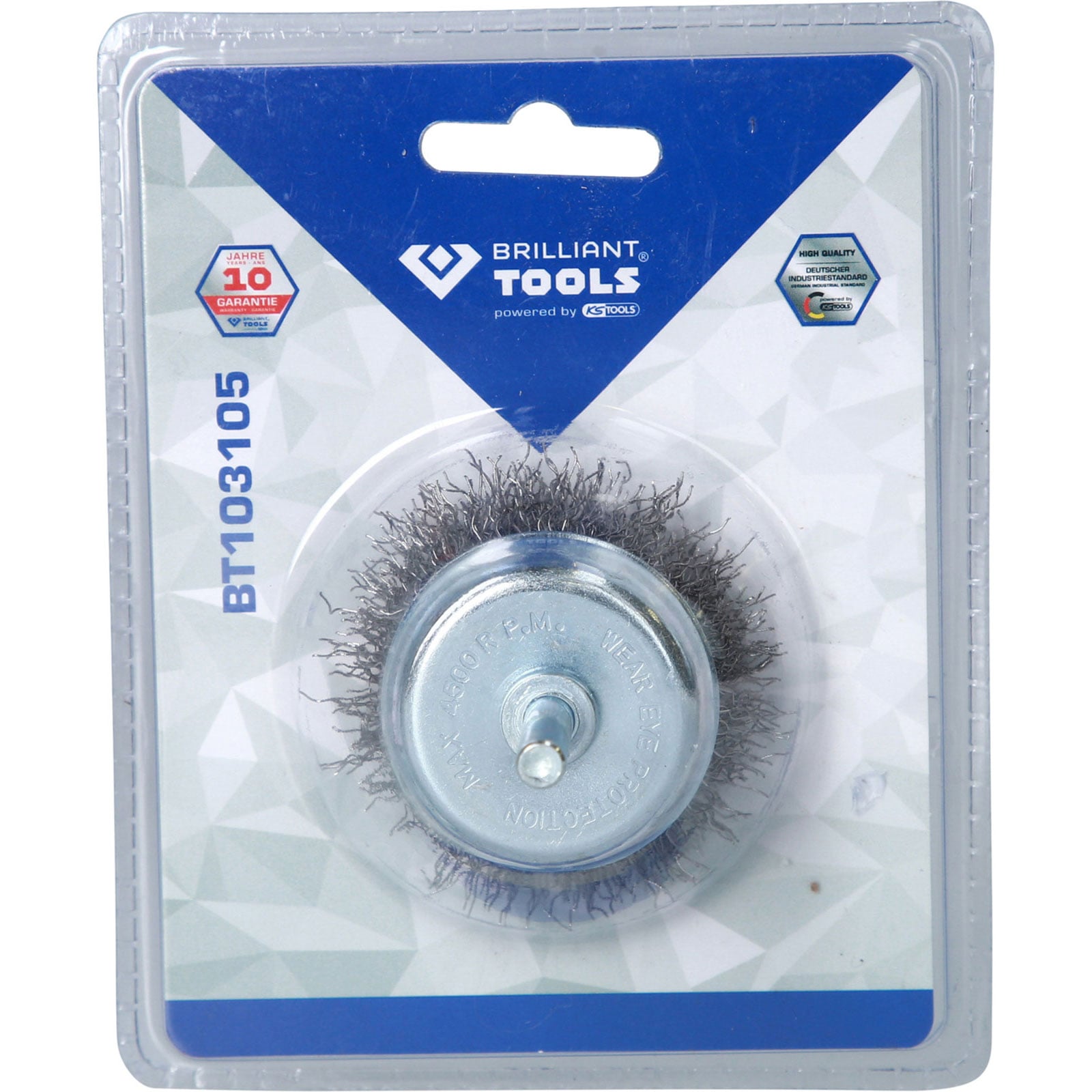 Die BRILLIANT TOOLS Topfbürste BT103105 ist ideal zum Entrosten, Säubern und Entlacken. Die Topfbürste mit gehärtetem Stahldraht ist besonders für schwer zugängliche Stellen oder großen Flächen geeignet. Sie hat einen Durchmesser von 50 mm und ist für max. 4.500 U/min ausgelegt. Durch den 6 mm Aufnahmeschaft kann sie mit einer handelsüblichen Bohrmaschine oder Akku-Bohrschrauber zum Einsatz kommen.