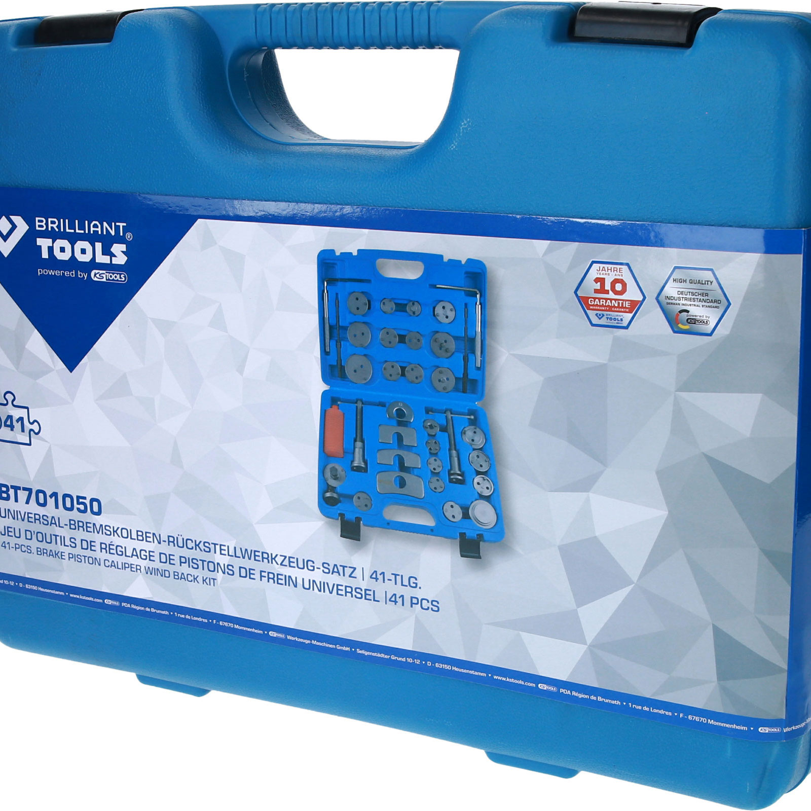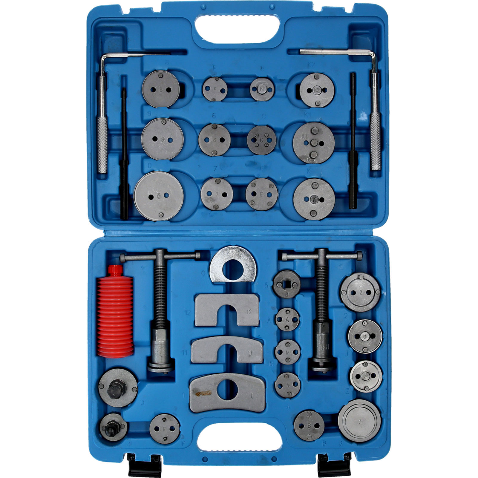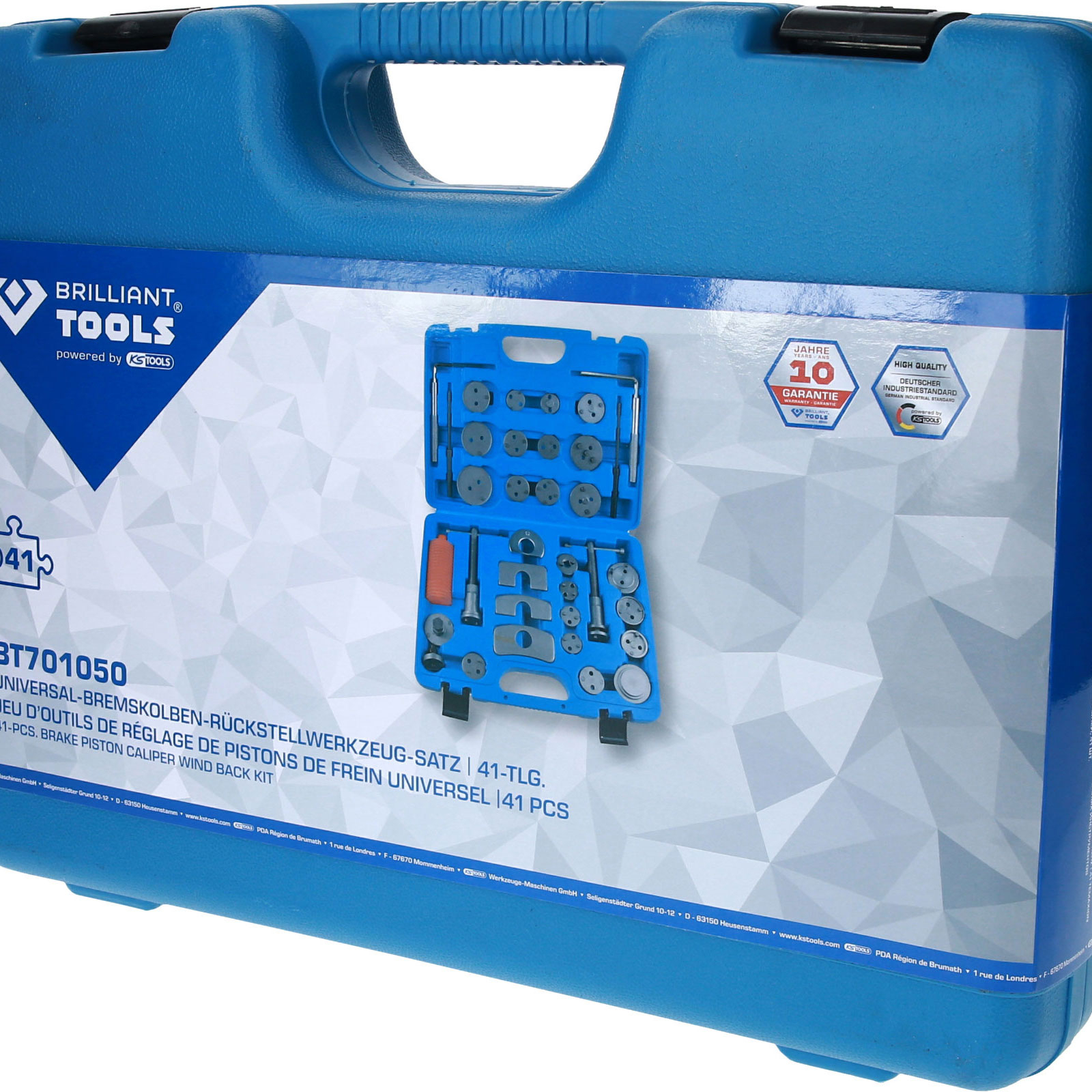 Der BRILLIANT TOOLS Universal-Bremskolben-Rückstellwerkzeug-Satz BT701050 ist ein umfangreiches Sortiment zum Rückstellen der Bremskolben aller gängigen Automarken. Die beiliegenden links und rechtsdrehenden Spindel Bremskolbenrücksteller drücken schonend und gleichmäßig die Kolben zurück. Dadurch werden keine Beschädigungen an Dichtungen oder sonstigem durch ungleichmäßigen Druck verursacht.