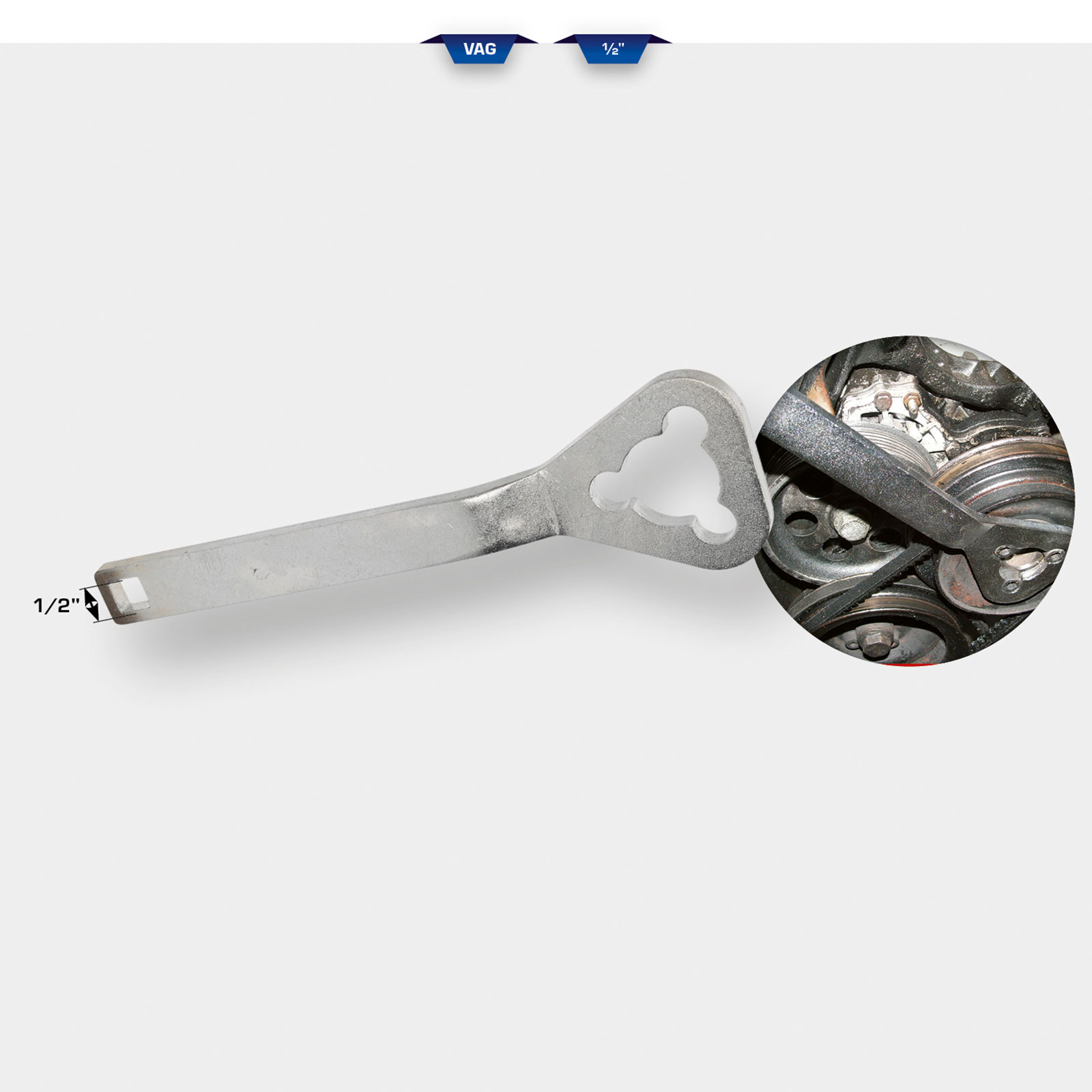 - Halteschlüssel zum sicheren Blockieren von Wasserpumpen-Riemenscheiben über die Befestigungsschrauben