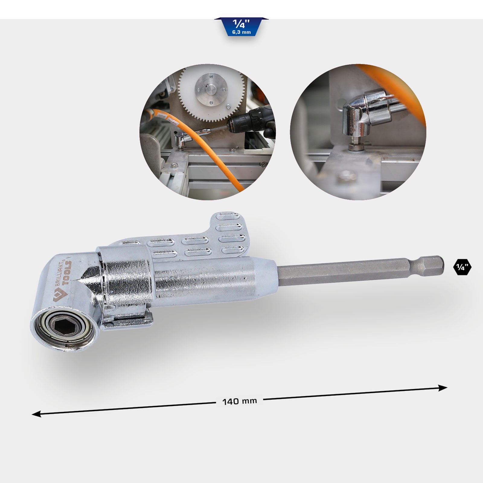 Der BRILLIANT TOOLS Winkel-Bithalter BT053001 ist um 105° abgewinkelt. Dies ermöglicht das Schrauben oder Bohren in engen Räumen. Durch den 1/4" (6,3 mm) Außensechskant Antrieb kann der Winkel-Bithalter mit Bohrmaschinen, Akku-Schrauber oder mit manuellen Werkzeugen angetrieben werden. Der magnetische 1/4" (6,3 mm) Innensechskant Abtrieb kann für Bits oder Bohrer mit einen Außensechskantantrieb nach DIN 3126 / ISO 1173 - C 6,3 genutzt werden.