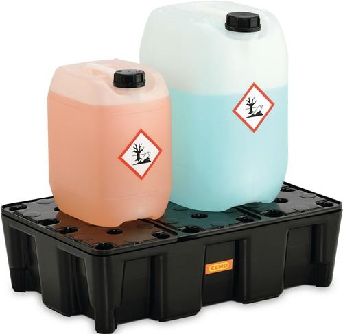 für Kleingebinde zur sicheren und vorschriftsmäßigen Lagerung gewässergefährdenden Flüssigkeiten der GHS-Kategorien 1-4 aus HD-Polyethylen sehr beständig gegen Laugen, Öle und Säuren stapelbar rutschsichere Plattenoberfläche konzipiert für Kombination auf Europalette