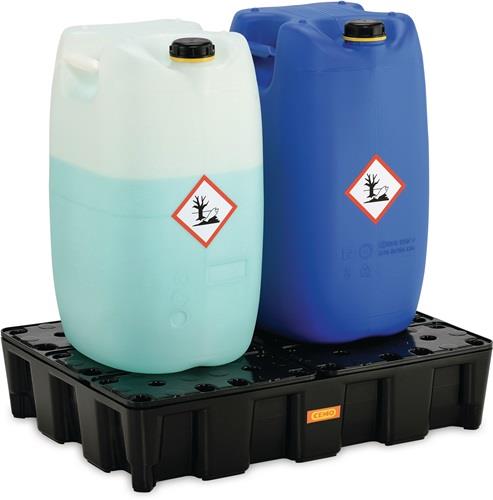 für Kleingebinde zur sicheren und vorschriftsmäßigen Lagerung gewässergefährdenden Flüssigkeiten der GHS-Kategorien 1-4 aus HD-Polyethylen sehr beständig gegen Laugen, Öle und Säuren stapelbar rutschsichere Plattenoberfläche konzipiert für Kombination auf Europalette