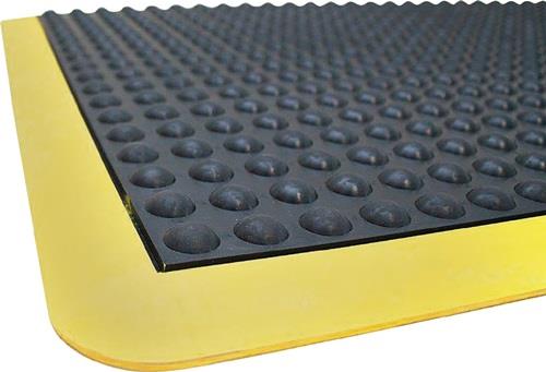 Naturgummi-Matte mit genoppter Oberfläche für trockene Innenbereiche Temperaturbeständigkeit von -30 °C bis +50 °C Mattenstärke 14 mm optimal für Arbeitsplätze mit langen statischen Stehphasen Rutschfestigkeit 30 BPN gemäß ASTM E304 Farbe schwarz/gelb Breite: 900 mm Länge: 1200 mm Oberfläche: genoppt Farbe: schwarz/gelb Ausführung: Fertigmatte Stärke: 14 mm Material: SBR-Gummi