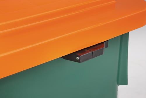 - robuste Scharniere verbinden den strapazierfähigen Deckel mit dem Behälter