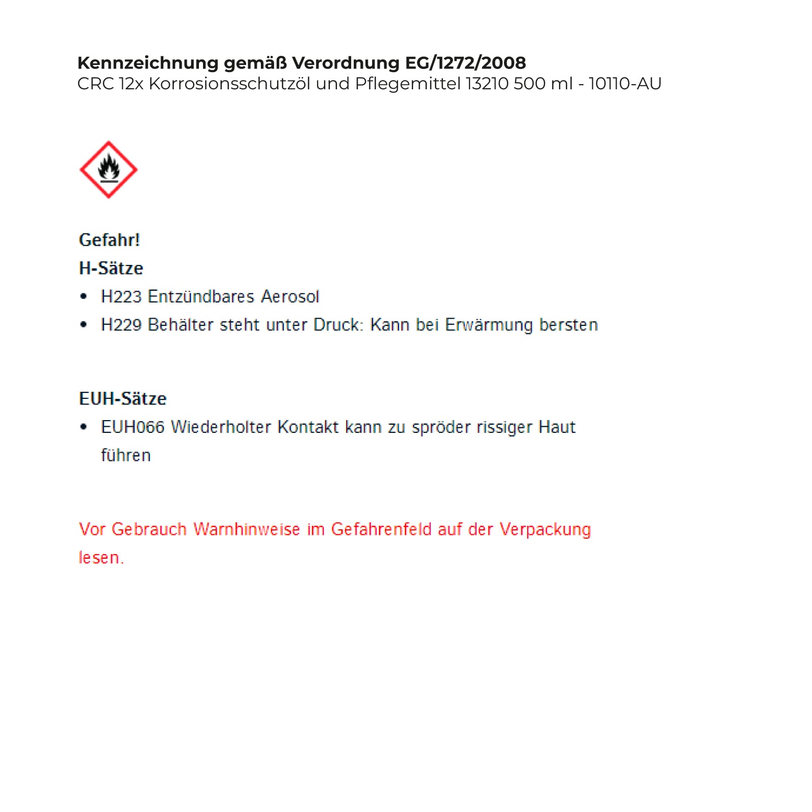 - EUH066 Wiederholter Kontakt kann zu spröder rissiger Haut führen